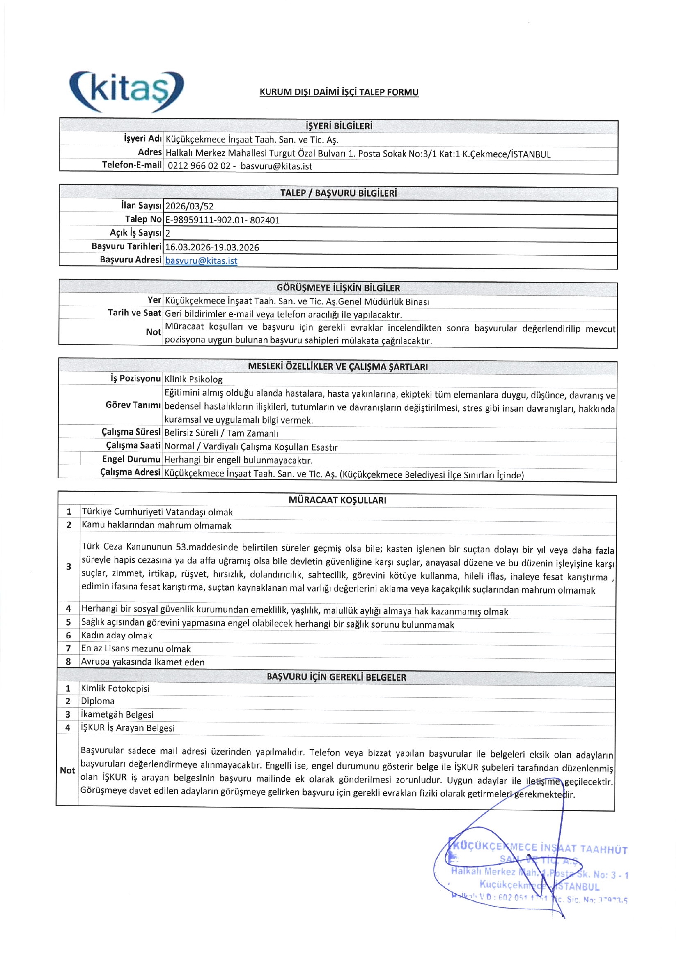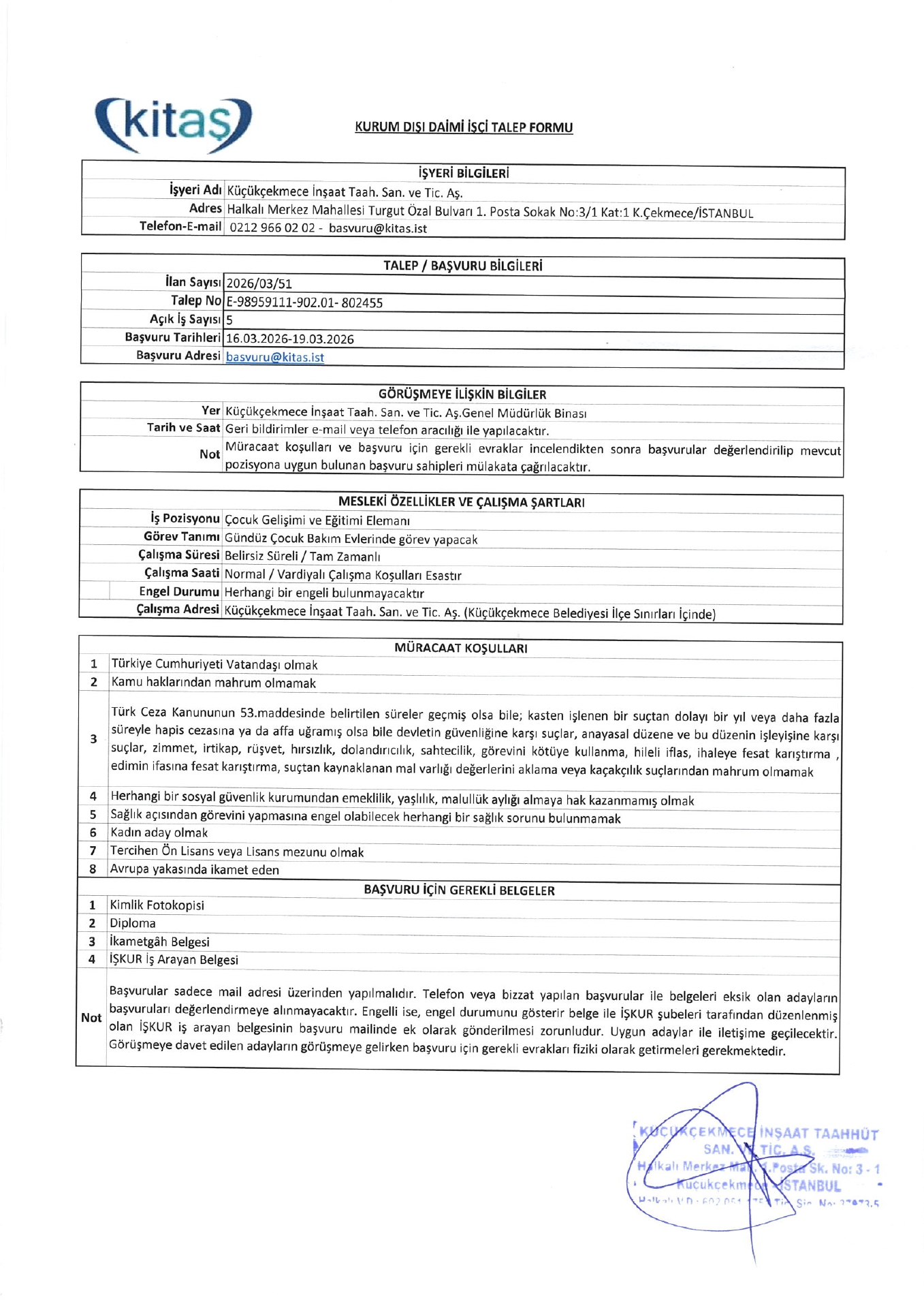 Ana sayfaDaimi İşçi İlanları İstanbul Küçükçekmece İnşaat 7 İşçi Alacak İstanbul Küçükçekmece İnşaat 7 İşçi Alacak. Son başvuru tarihi 26 Mart 2026 Kaynak : İşkur İlan Giriş : 17 Mart 2026 23:00, Son Güncelleme : 17 Mart 2026 23:44 Yazdır Yorumlar (0) Abone Ol