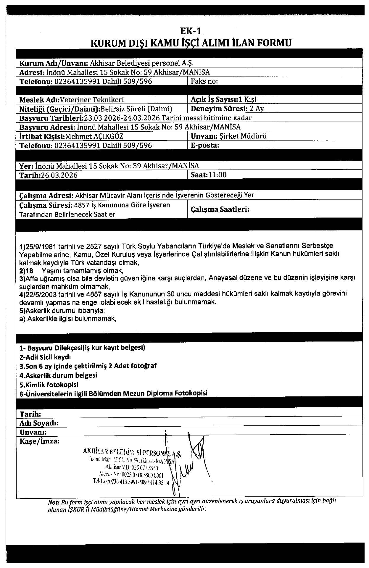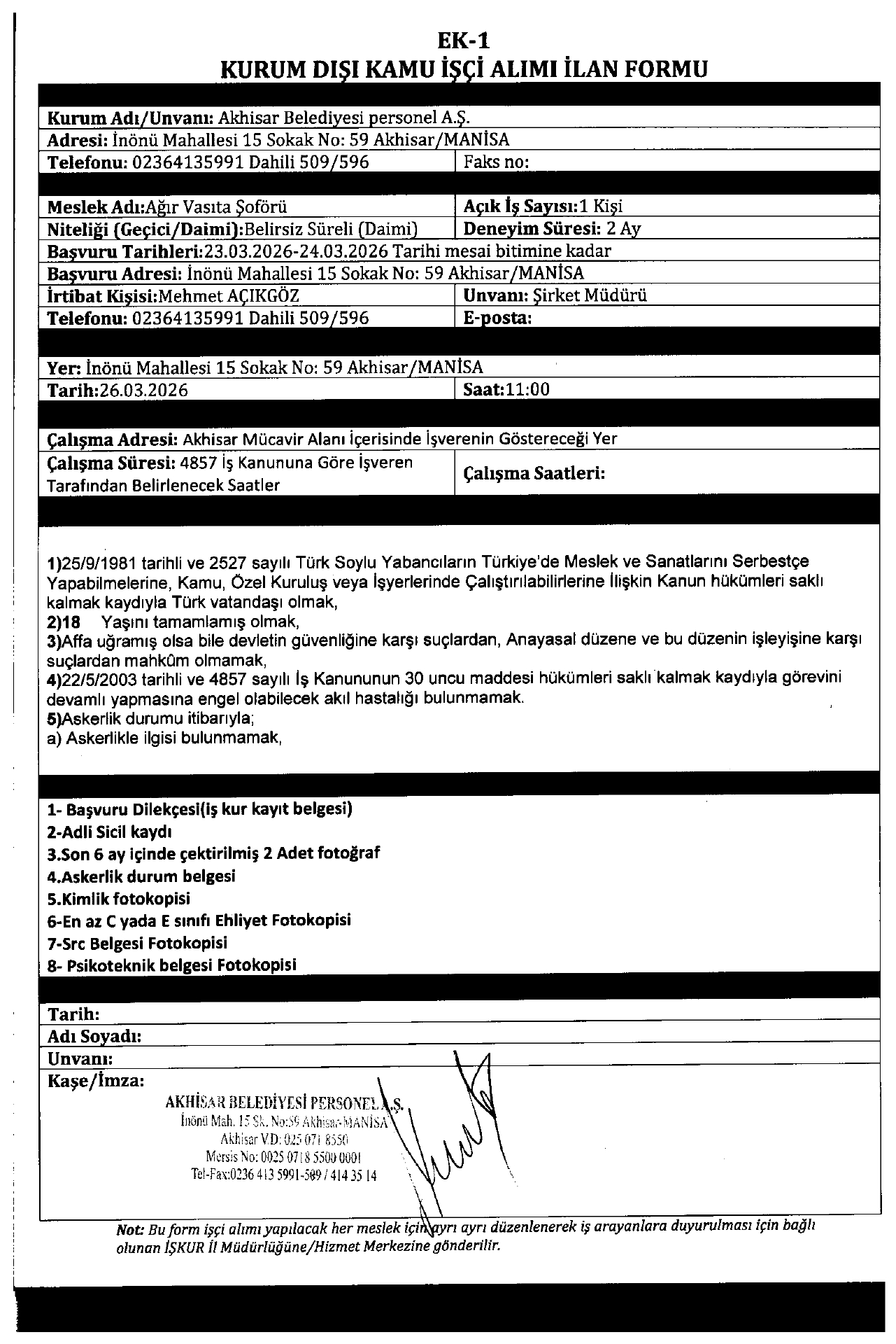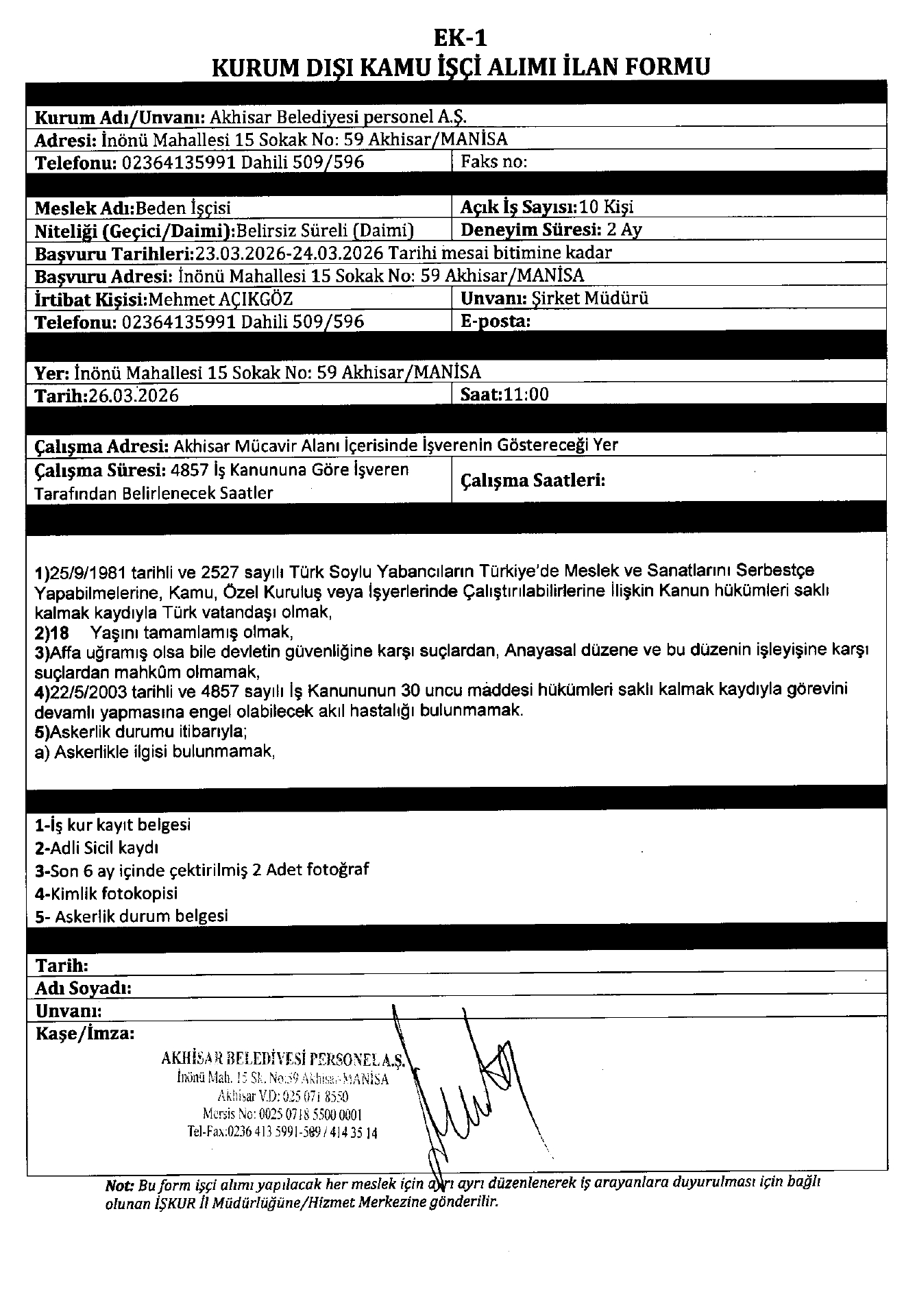 Ana sayfaDaimi İşçi İlanları Manisa Akhisar Belediyesi 12 İşçi Alacak Manisa Akhisar Belediyesi 12 İşçi Alacak. Son başvuru tarihi 23 Mart 2026 Kaynak : İşkur İlan Giriş : 18 Mart 2026 23:35, Son Güncelleme : 19 Mart 2026 00:14 Yazdır Yorumlar (0) Abone Ol