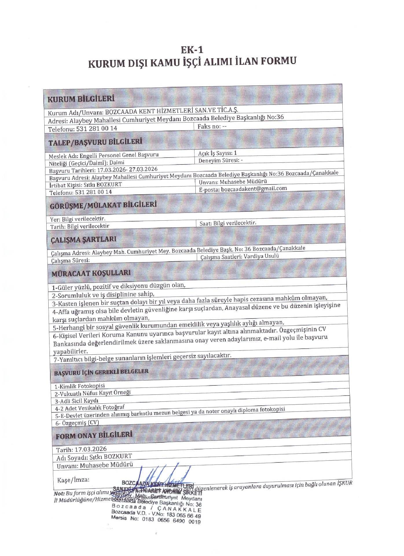 Çanakkale Bozcaada Kent Hizmetleri 1 İşçi Alacak. Son başvuru tarihi 27 Mart 2026
