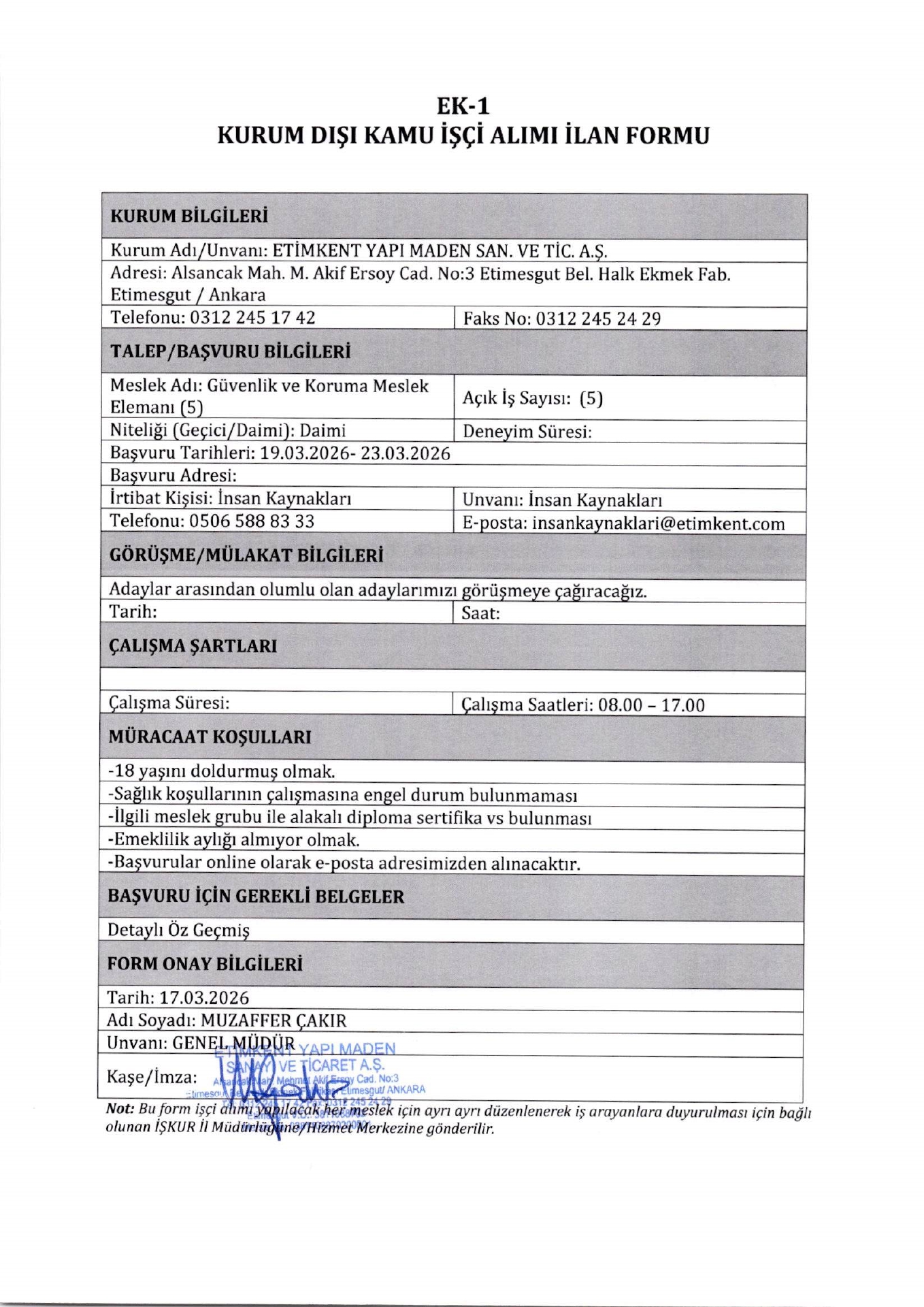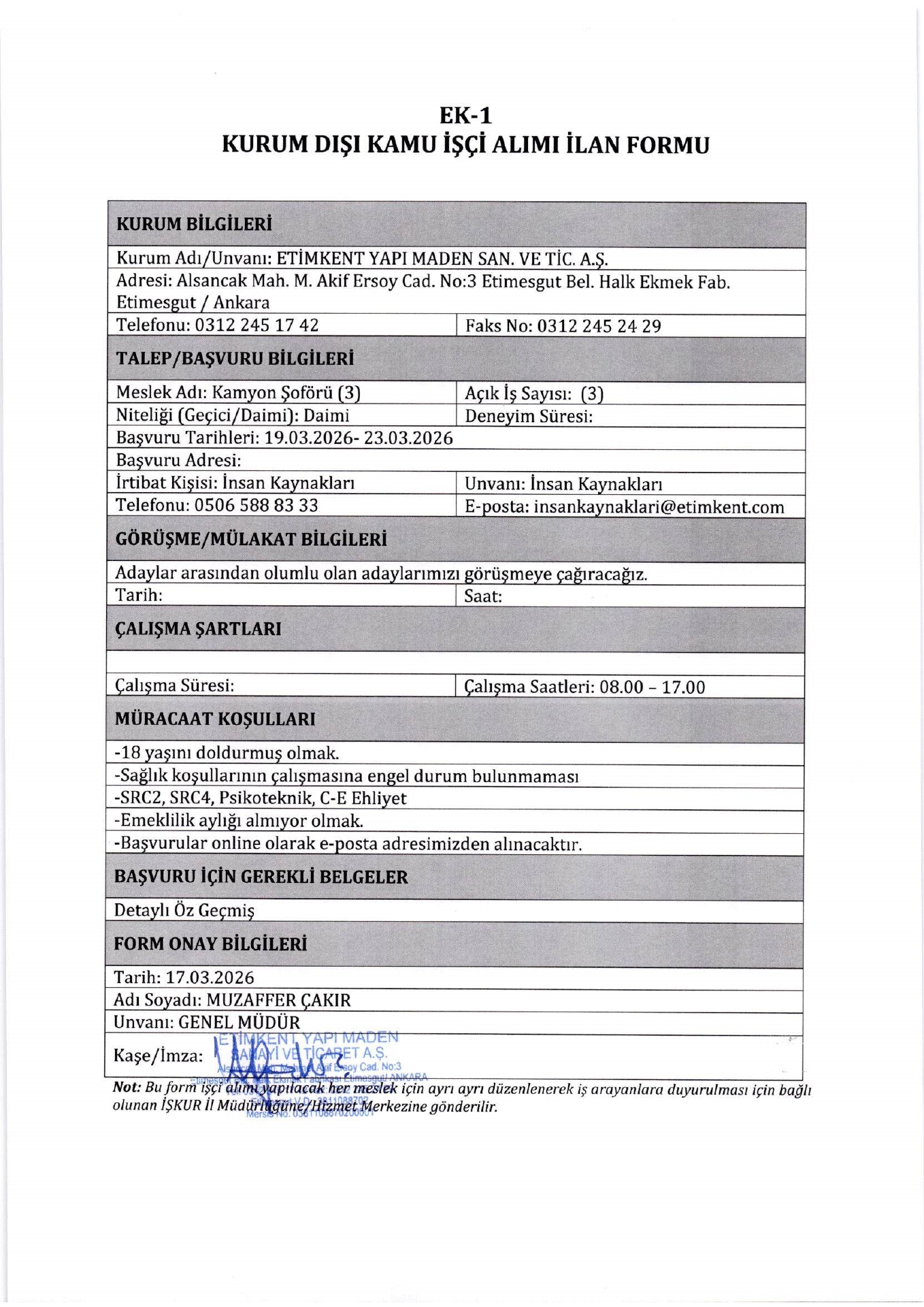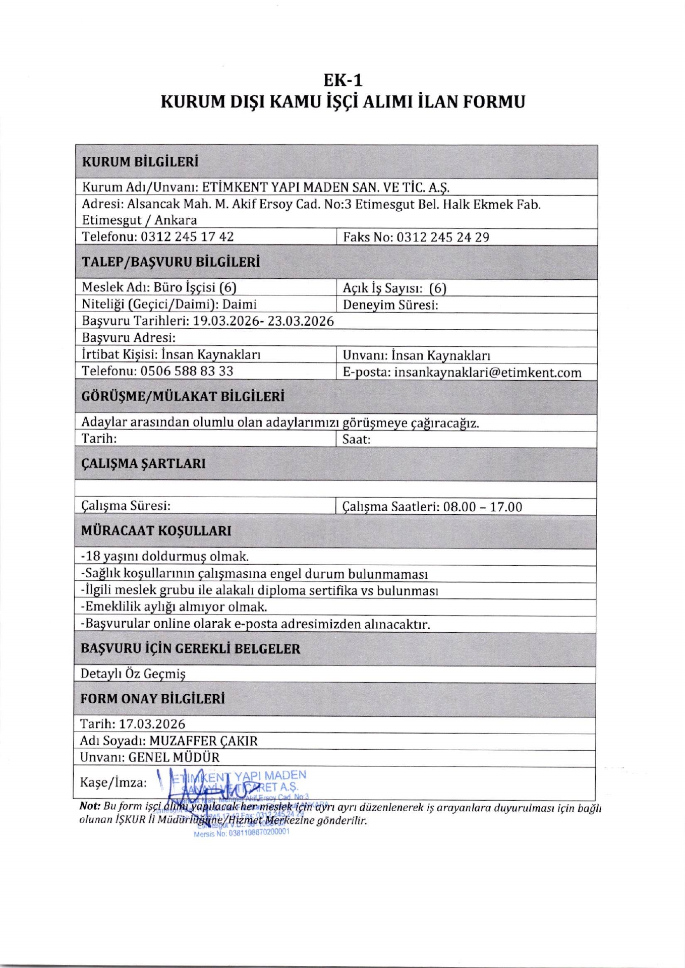 Ankara Etimkent 16 İşçi Alacak. Son başvuru tarihi 23 Mart 2026