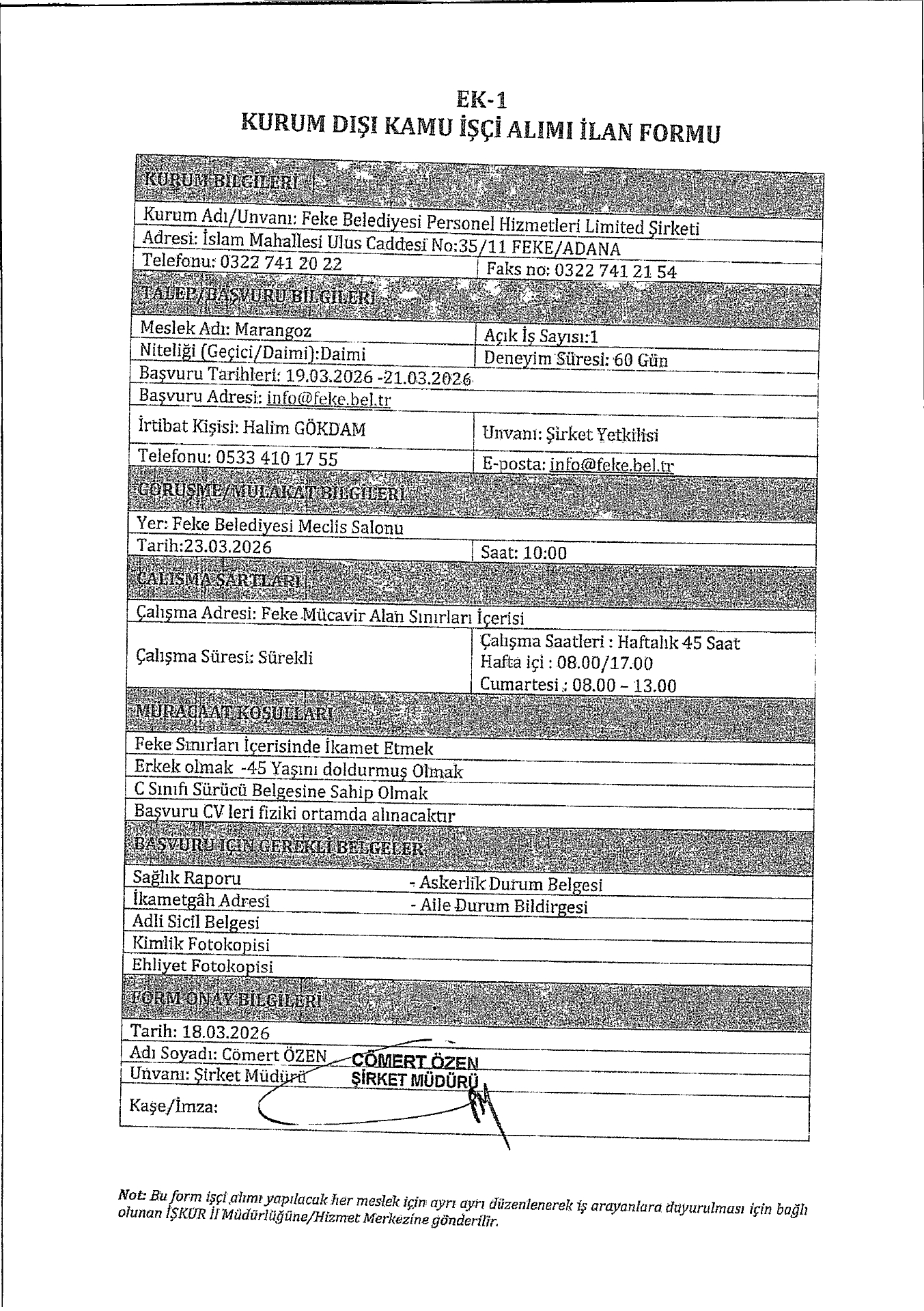Ana sayfaDaimi İşçi İlanları Adana Feke Belediyesi 1 İşçi Alacak Adana Feke Belediyesi 1 İşçi Alacak. Son başvuru tarihi 21 Mart 2026 Kaynak : İşkur İlan Giriş : 18 Mart 2026 23:47, Son Güncelleme : 19 Mart 2026 00:09 Yazdır Yorumlar (0) Abone Ol