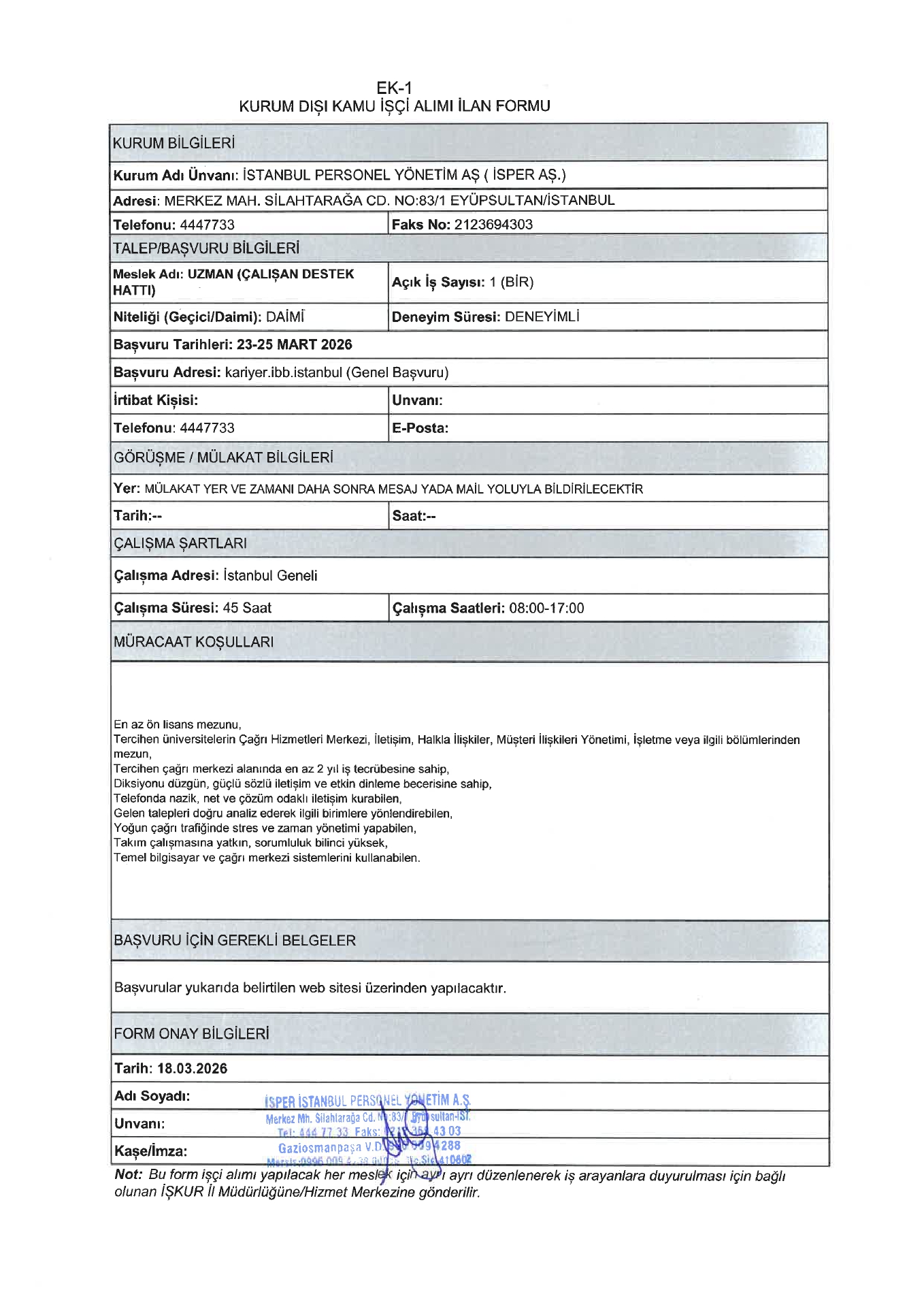 Ana sayfaDaimi İşçi İlanları İstanbul Personel Yönetim Aş. 1 İşçi Alacak İstanbul Personel Yönetim Aş. 1 İşçi Alacak. Son başvuru tarihi 25 Mart 2026 Kaynak : İşkur İlan Giriş : 18 Mart 2026 23:50, Son Güncelleme : 19 Mart 2026 00:07 Yazdır Yorumlar (0) Abone Ol