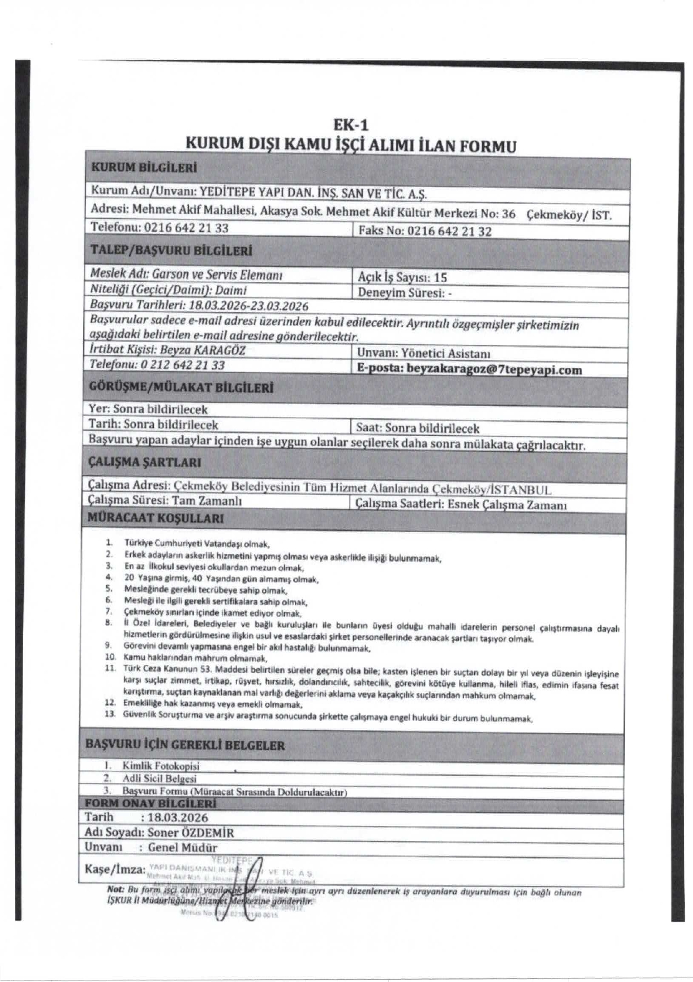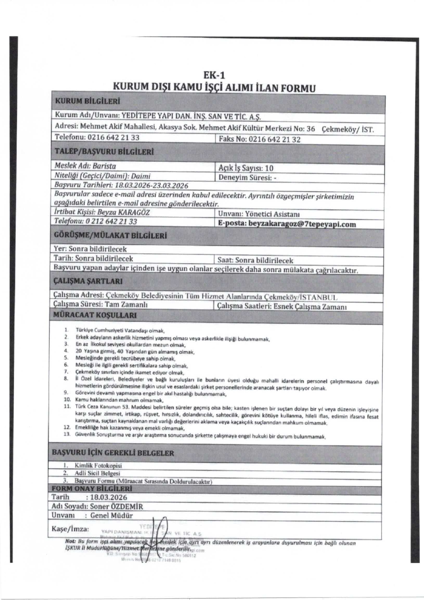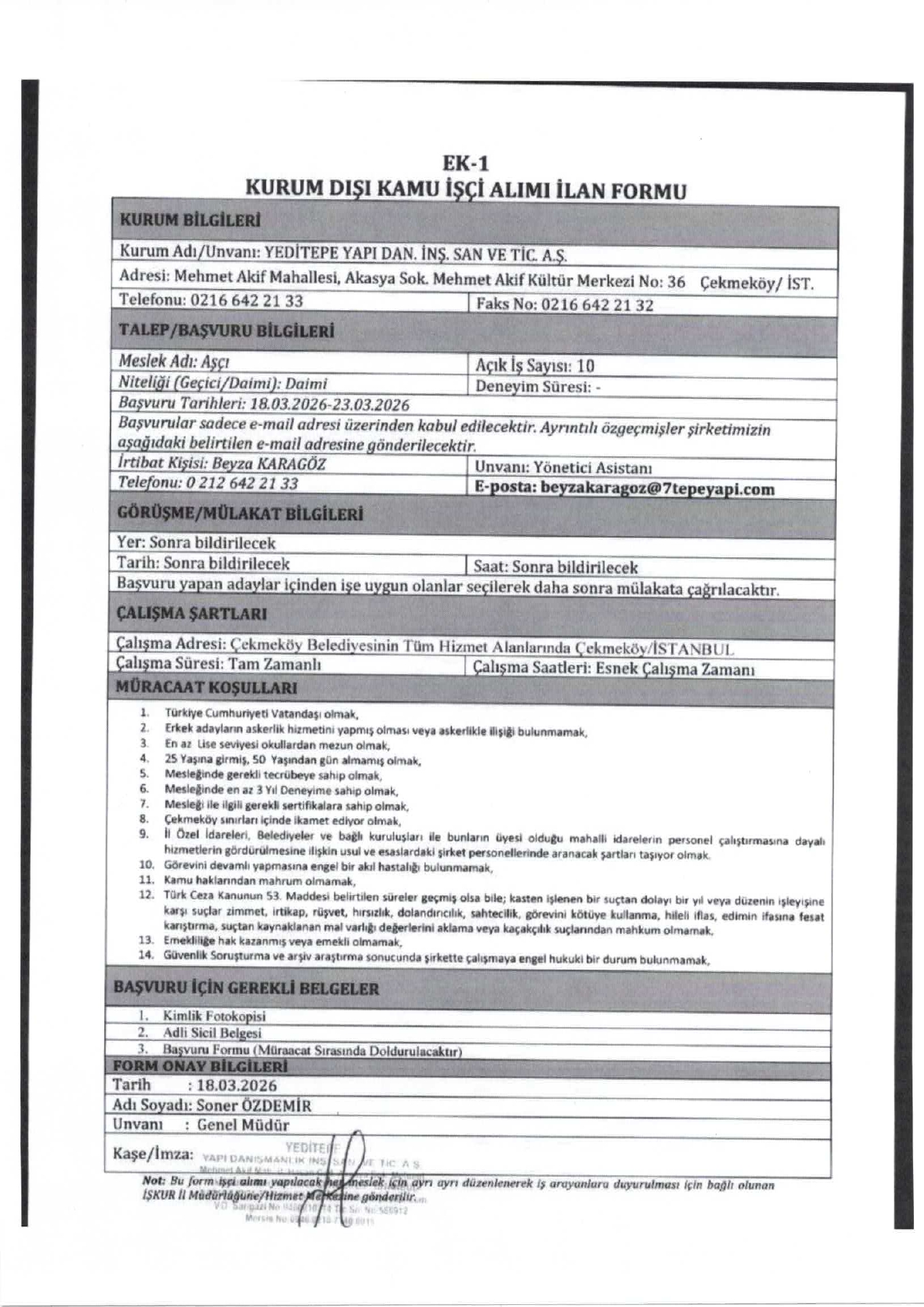 Ana sayfaDaimi İşçi İlanları İstanbul Yeditepe Yapı 35 İşçi Alacak İstanbul Yeditepe Yapı 35 İşçi Alacak. Son başvuru tarihi 23 Mart 2026 Kaynak : İşkur İlan Giriş : 18 Mart 2026 23:55, Son Güncelleme : 19 Mart 2026 00:07 Yazdır Yorumlar (0) Abone Ol