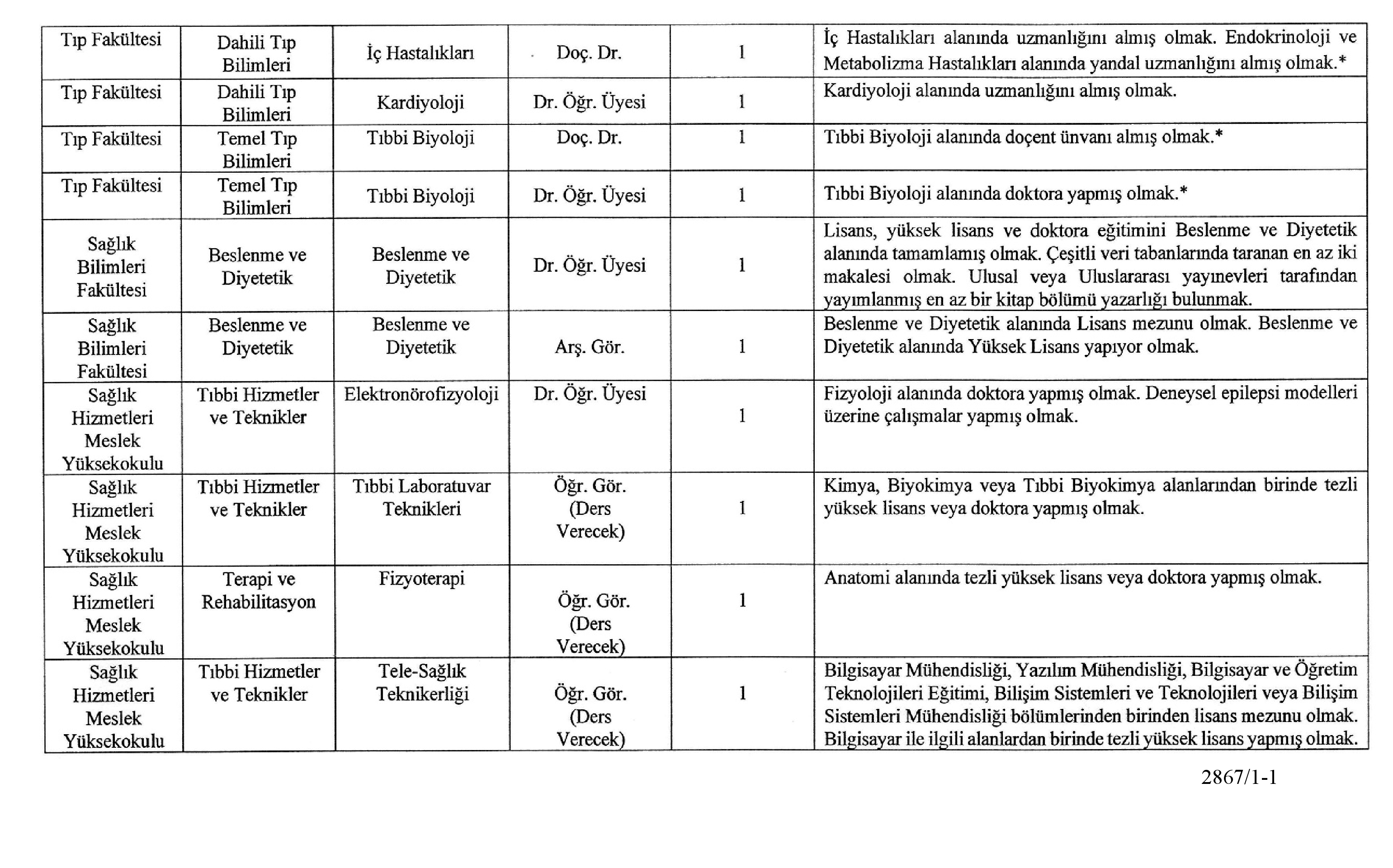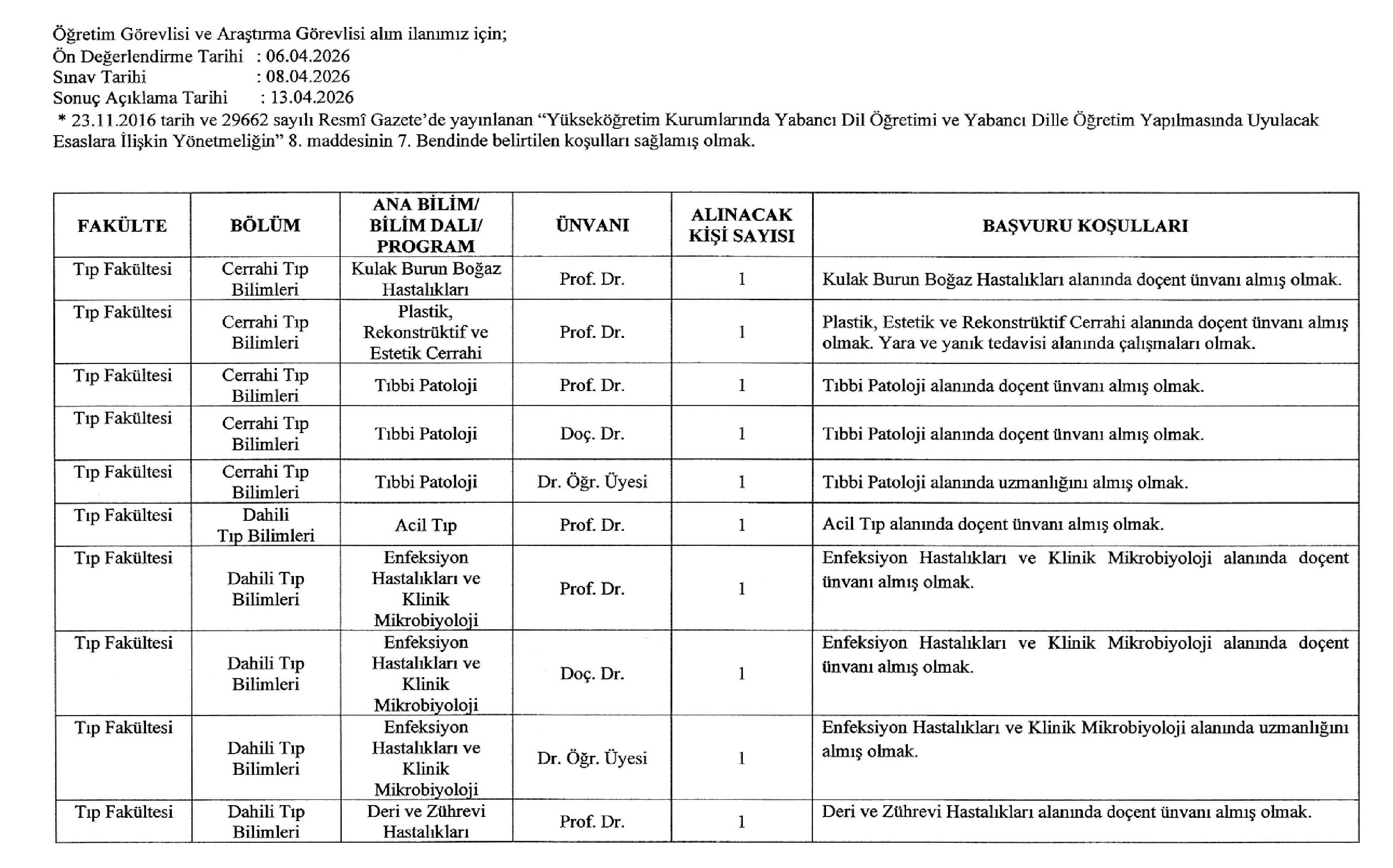 Doktor Öğretim Üyesi, Öğretim Görevlisi ve Araştırma Görevlisi kadrolarına müracaat edecek adayların ise Yönetmelik hükümleri uyarınca ilgili Fakülte Dekanlıklarına, Yüksekokul Müdürlüklerine şahsen veya posta yoluyla başvurmaları gerekmektedir.