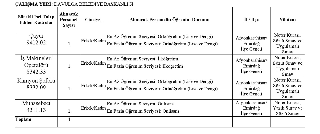 1. Davulga Belediye Başkanlığı ALINACAK OLAN SÜREKLİ İŞÇİ NOTER KURASI USULÜNE TABİ TALEPLERDEN; Çaycı, İş Makineleri Operatörü, Kamyon Şoförü ve Muhasebeci personeline ilişkin başvuru listesi, İŞKUR tarafından Davulga Belediye Başkanlığı ne gönderilmesine müteakip Türkiye İş Kurumu (İŞKUR)'nun gönderdiği ve talep şartlarına uyan başvuru sahiplerinin tamamının yer aldığı listeler esas alınmak suretiyle noter huzurunda kura ile belirlenecek olup boş kadronun 4 (dört) katı asıl ve 4 (dört) katı yedek adayın isimlerini kapsayan liste oluşturulacaktır. Belirlenen asıl ve yedek aday listeleri Davulga Belediye Başkanlığı web sayfasında(www.davulga.bel.tr) ilan edilecektir.