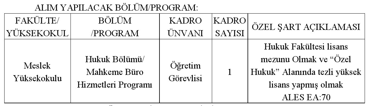 Üniversitemize aylık ve özlük hakları yönünden 4857 sayılı İş Kanunu hükümlerine tabi, tam zamanlı görev yapacak, 2547 sayılı Yükseköğretim Kanunu ve Öğretim Üyesi Dışındaki Öğretim Elemanı Kadrolarına Yapılacak Atamalarda Uygulanacak Merkezi Sınav ile Giriş Sınavına İlişkin Usul ve Esaslar Hakkında Yönetmelik gereğince öngörülen koşulları sağlamış olmak şartı ile öğretim elemanı alınacaktır.