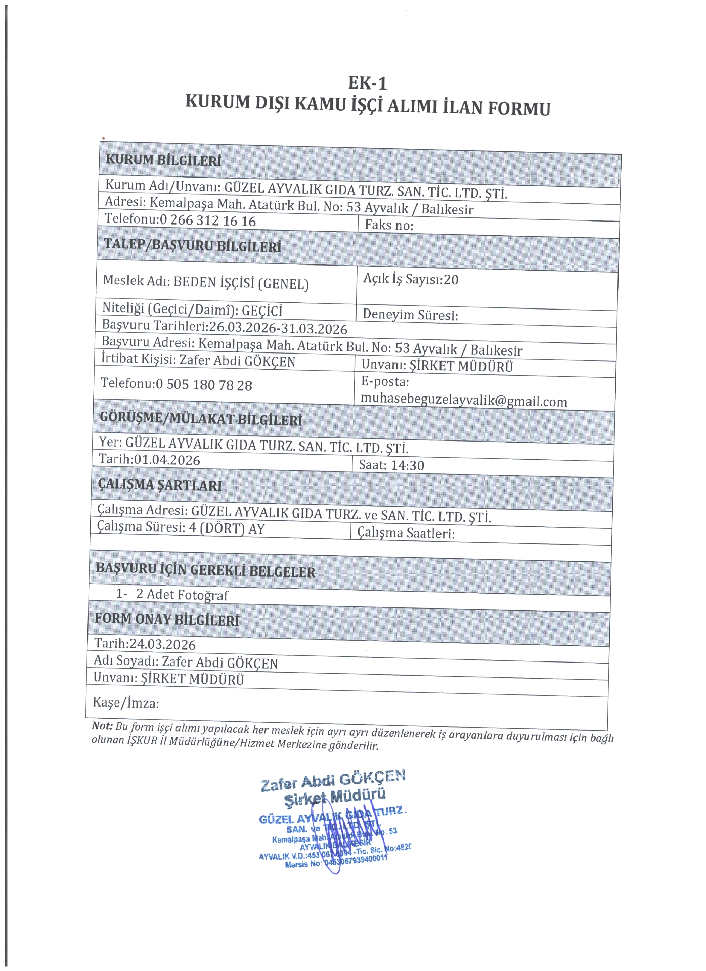 Ana sayfaGeçici İşçi İlanları Balıkesir Güzel Ayvalık Turizm Geçici 20 İşçi Alacak Balıkesir Güzel Ayvalık Turizm Geçici 20 İşçi Alacak. Son başvuru tarihi 31 Mart 2026 Kaynak : İşkur İlan Giriş : 25 Mart 2026 00:32, Son Güncelleme : 25 Mart 2026 01:41 Yazdır Yorumlar (0) Abone Ol