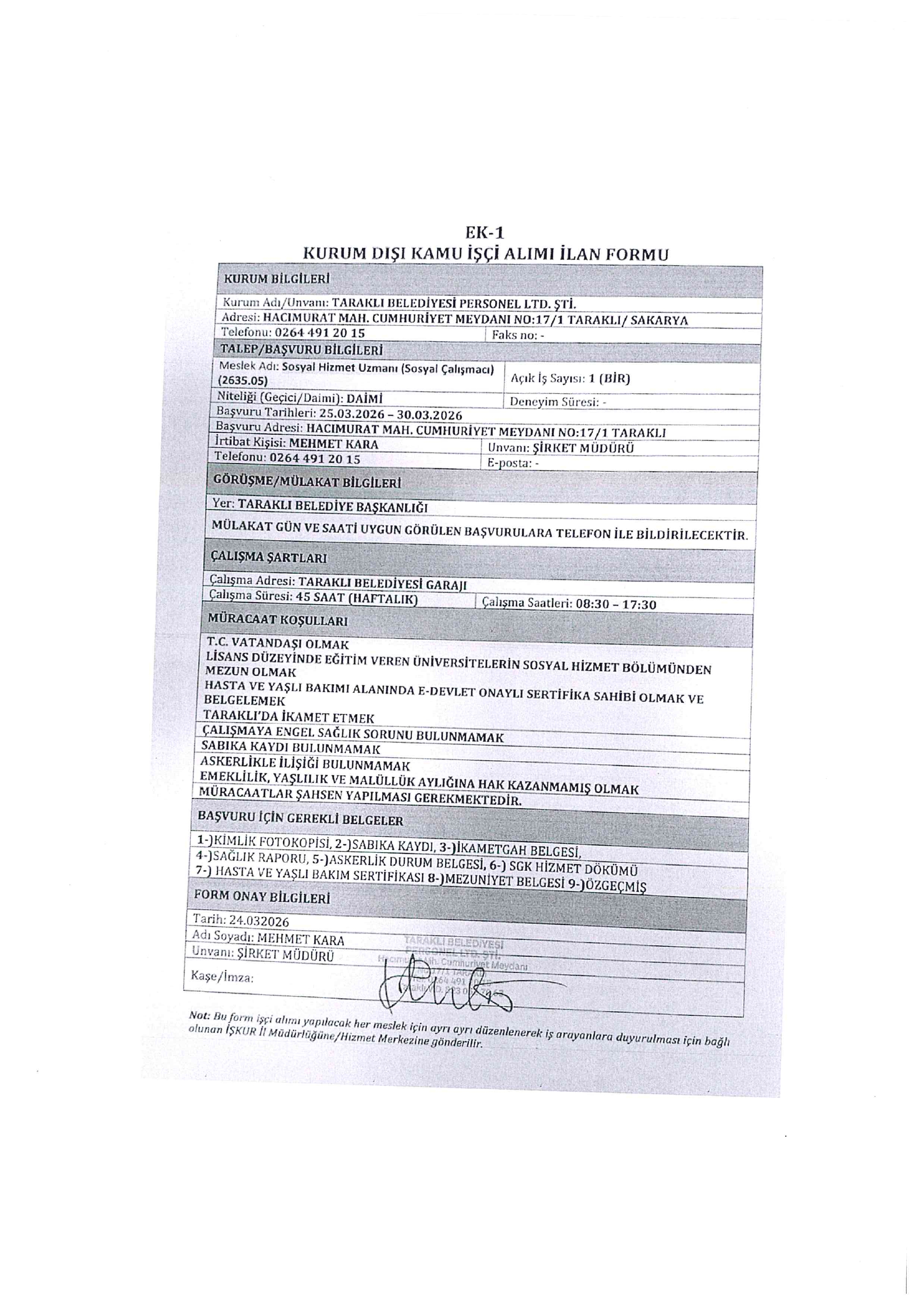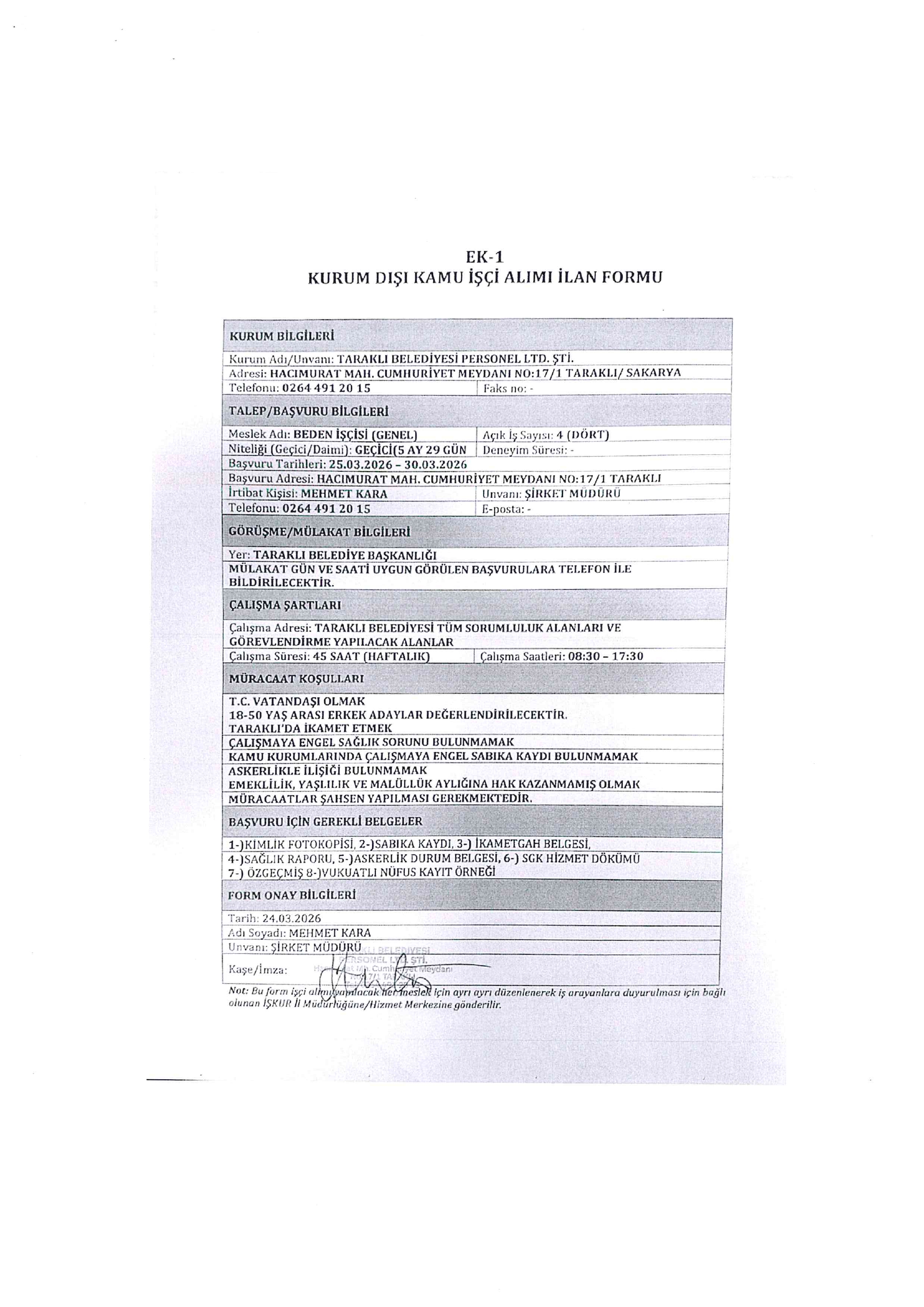 Ana sayfaDaimi İşçi İlanları Sakarya Taraklı Belediyesi 5 İşçi Alacak Sakarya Taraklı Belediyesi 5 İşçi Alacak. Son başvuru tarihi 30 Mart 2026 Kaynak : İşkur İlan Giriş : 25 Mart 2026 21:32, Son Güncelleme : 25 Mart 2026 22:42 Yazdır Yorumlar (0) Abone Ol