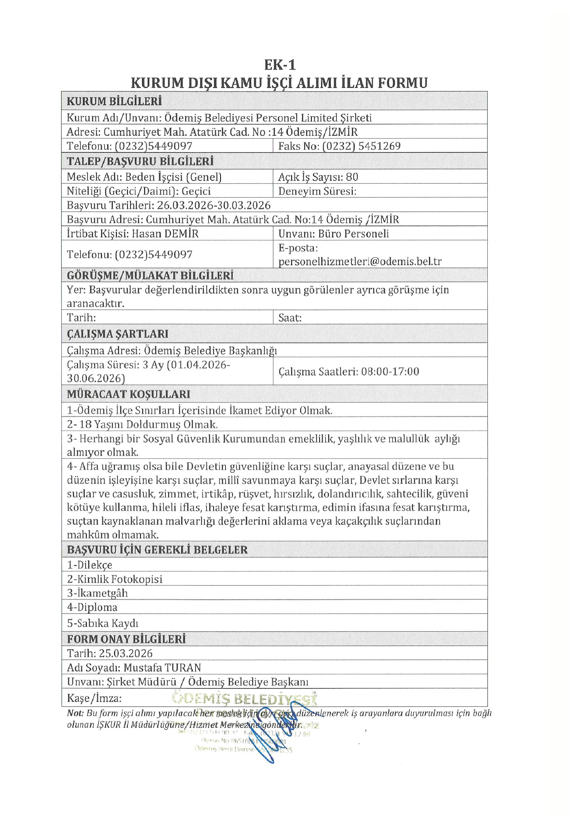 İzmir Ödemiş Belediyesi Geçici 80 İşçi Alacak. Son başvuru tarihi 30 Mart 2026