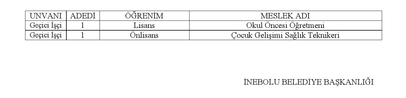 Kurumumuz İnebolu Belediye Başkanlığına alınacak 2 adet Geçici İşçi için, 09 Ağustos 2009 tarih ve 27314 sayılı Resmi Gazetede yayımlanarak yürürlüğe giren Kamu Kurum ve Kuruluşlarına İşçi Alınmasında Uygulanacak Usul ve Esaslar Hakkında Yönetmelik hükümlerine göre Çalışma ve İş Kurumu Kastamonu İl Müdürlüğüne İşgücü talebinde bulunulmuş olup, iş ilanımızın 27/03/2026-31/03/2026 tarihleri arasında yayımlanması talep edilmiştir.