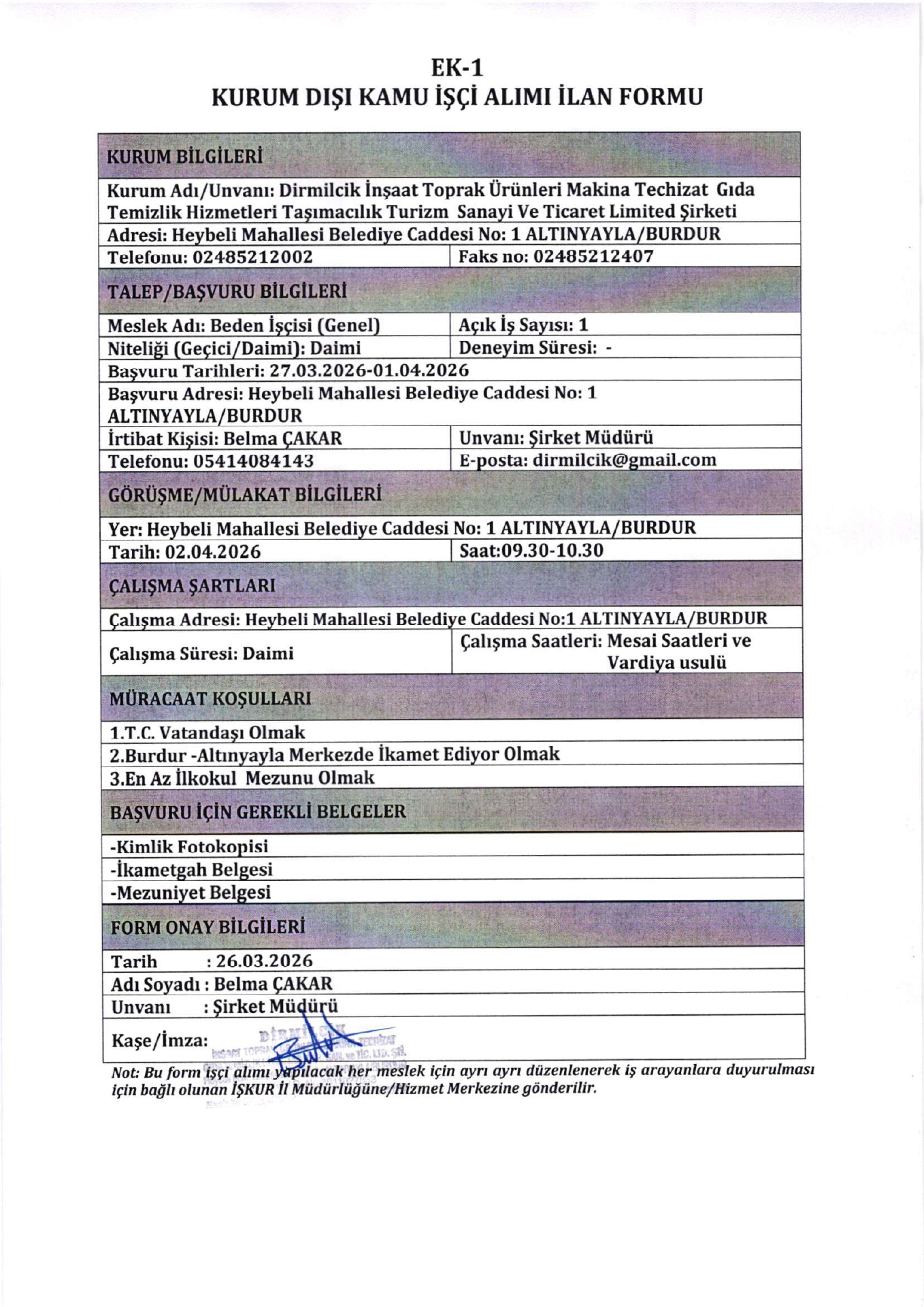 Burdur Dirmilcik İnşaat 1 İşçi Alacak. Son başvuru tarihi 1 Nisan 2026