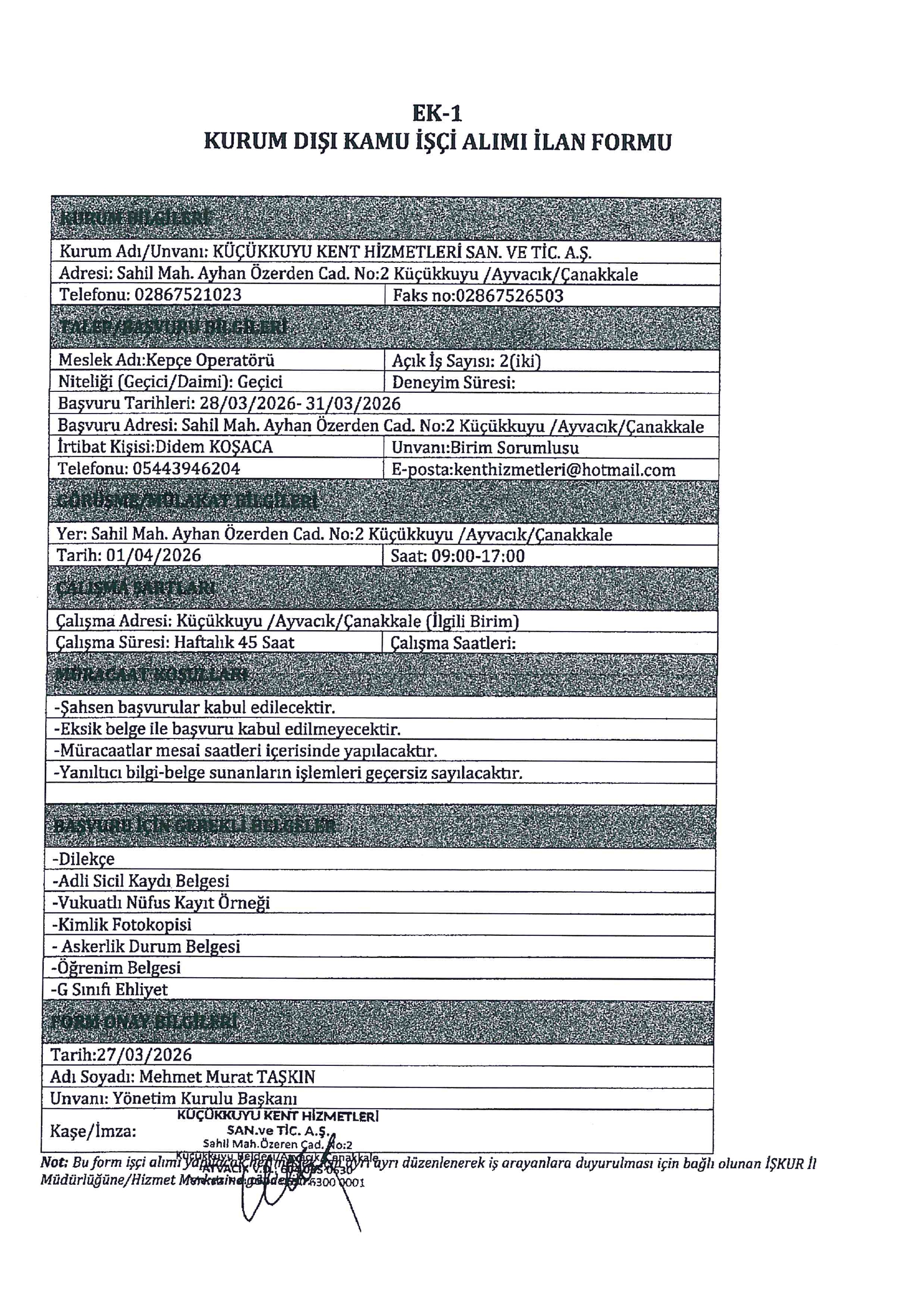 Çanakkale Küçükkuyu Kent Hizmetleri Geçici 2 İşçi Alacak. Son başvuru tarihi 31 Mart 2026