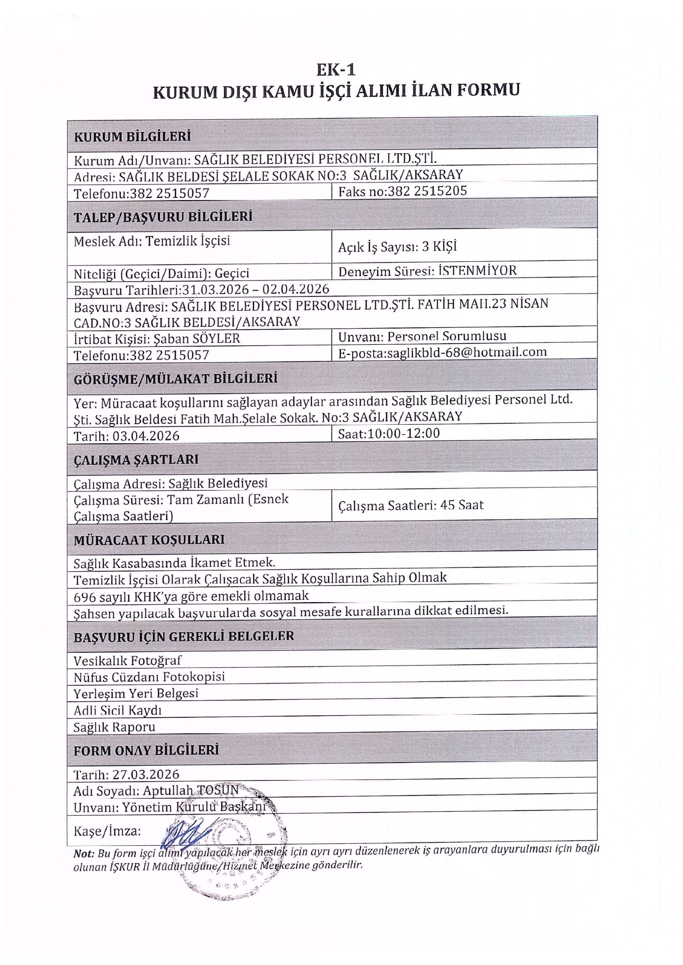 Ana sayfaGeçici İşçi İlanları Aksaray Sağlık Belediyesi Geçici 3 İşçi Alacak Aksaray Sağlık Belediyesi Geçici 3 İşçi Alacak. Son başvuru tarihi 2 Nisan 2026 Kaynak : İşkur İlan Giriş : 30 Mart 2026 22:13, Son Güncelleme : 30 Mart 2026 23:25 Yazdır Yorumlar (0) Abone Ol