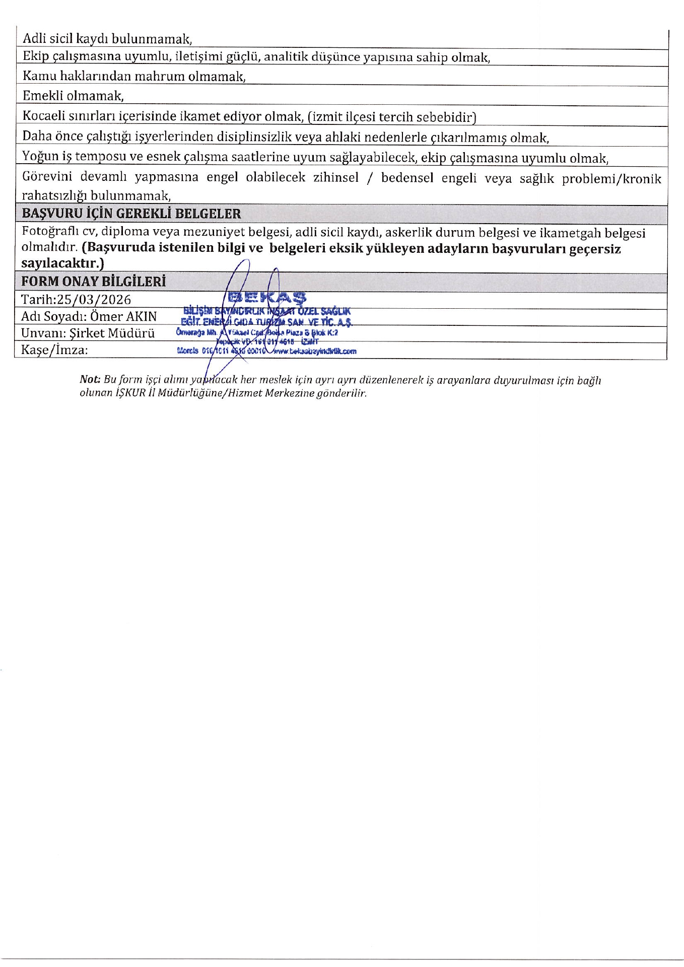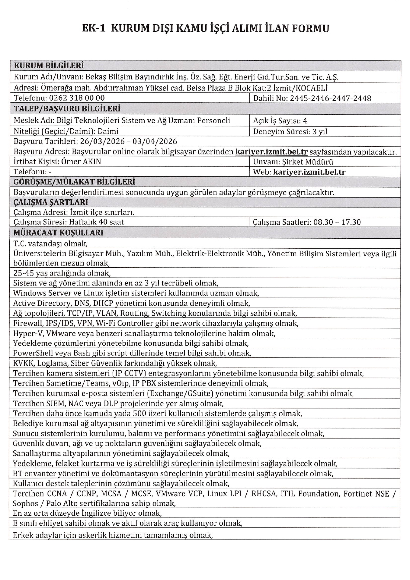 Ana sayfaDaimi İşçi İlanları Kocaeli Bekaş Bilişim 4 İşçi Alacak Kocaeli Bekaş Bilişim 4 İşçi Alacak. Son başvuru tarihi 3 Nisan 2026 Kaynak : İşkur İlan Giriş : 30 Mart 2026 22:19, Son Güncelleme : 30 Mart 2026 23:23 Yazdır Yorumlar (0) Abone Ol