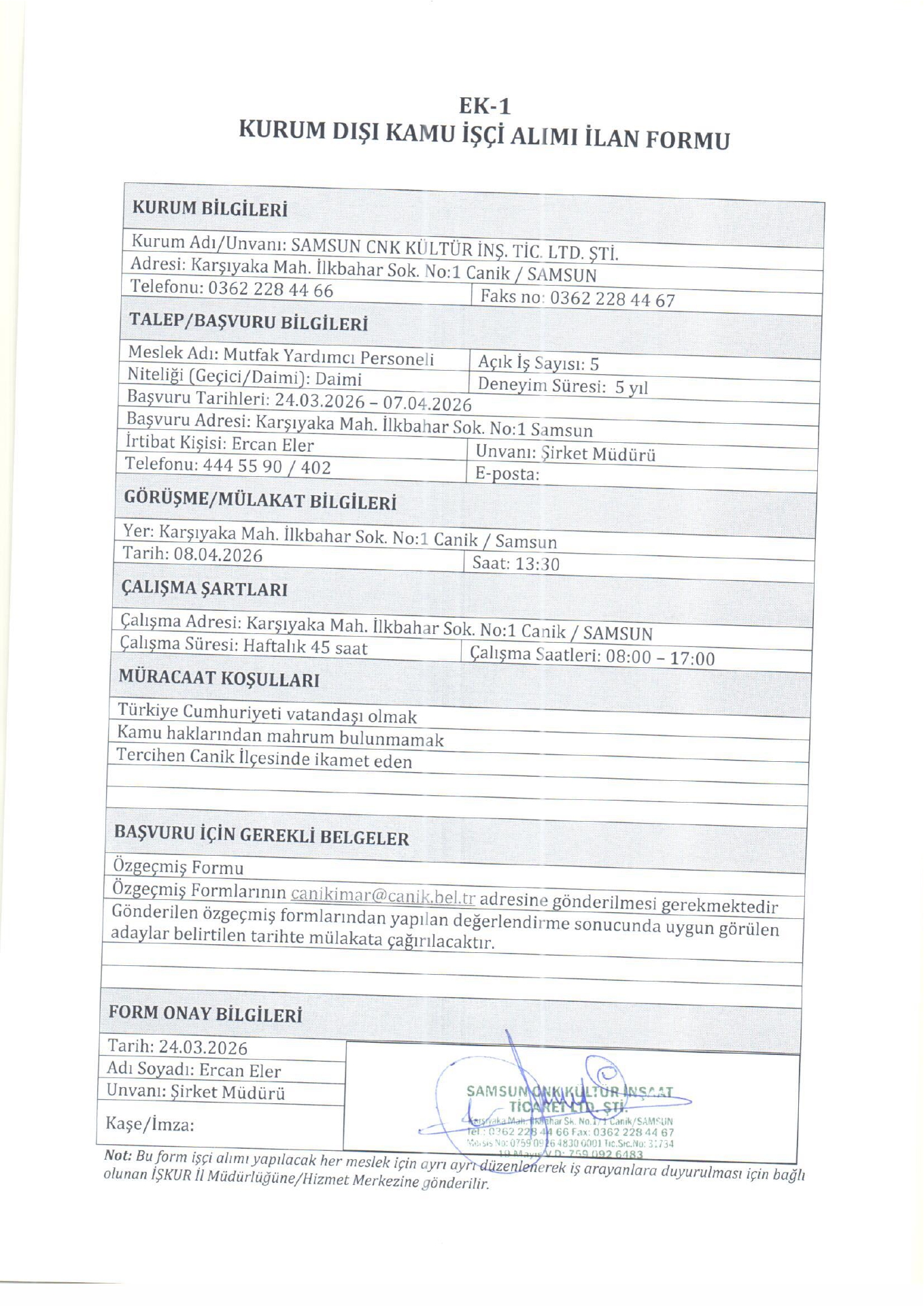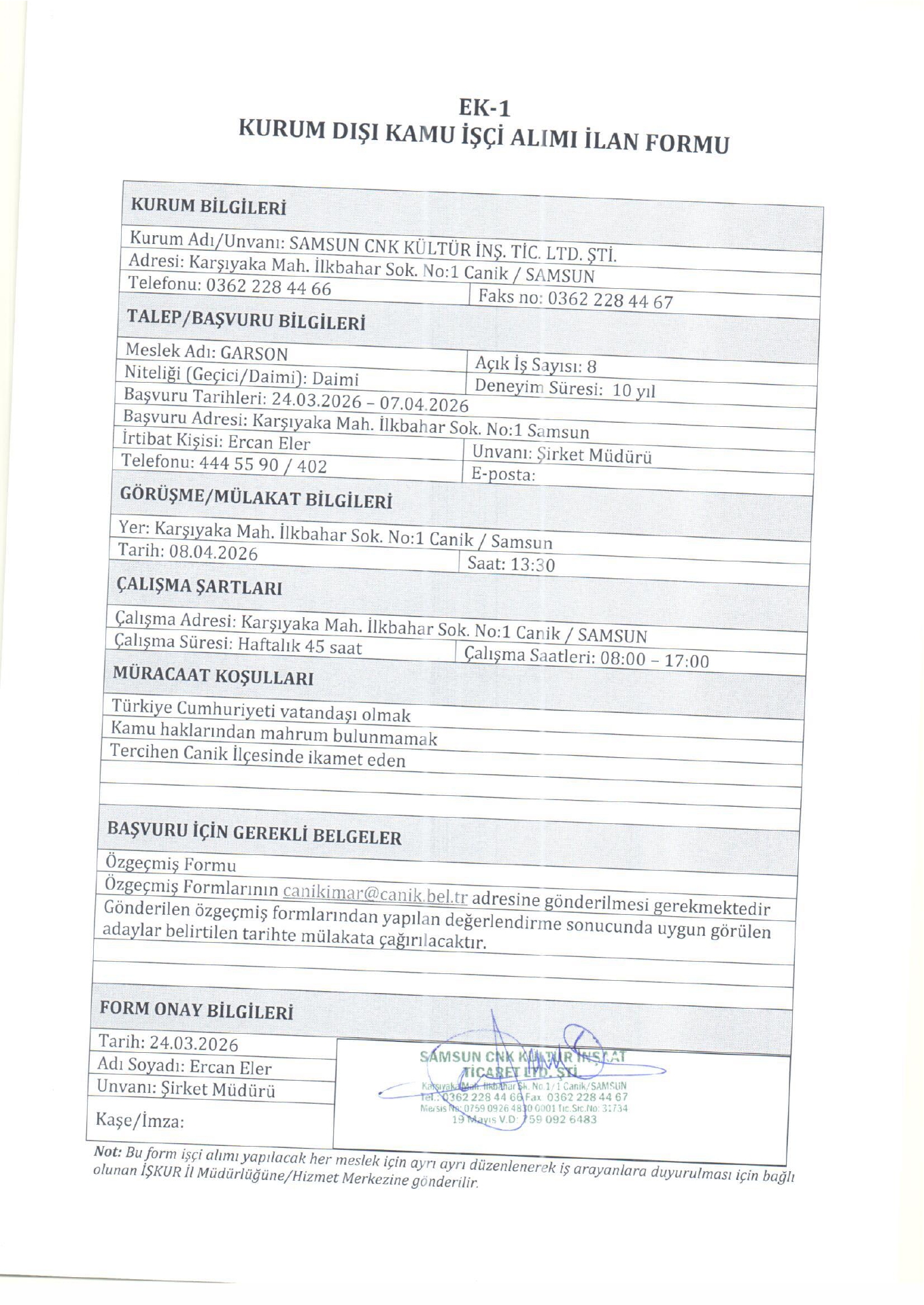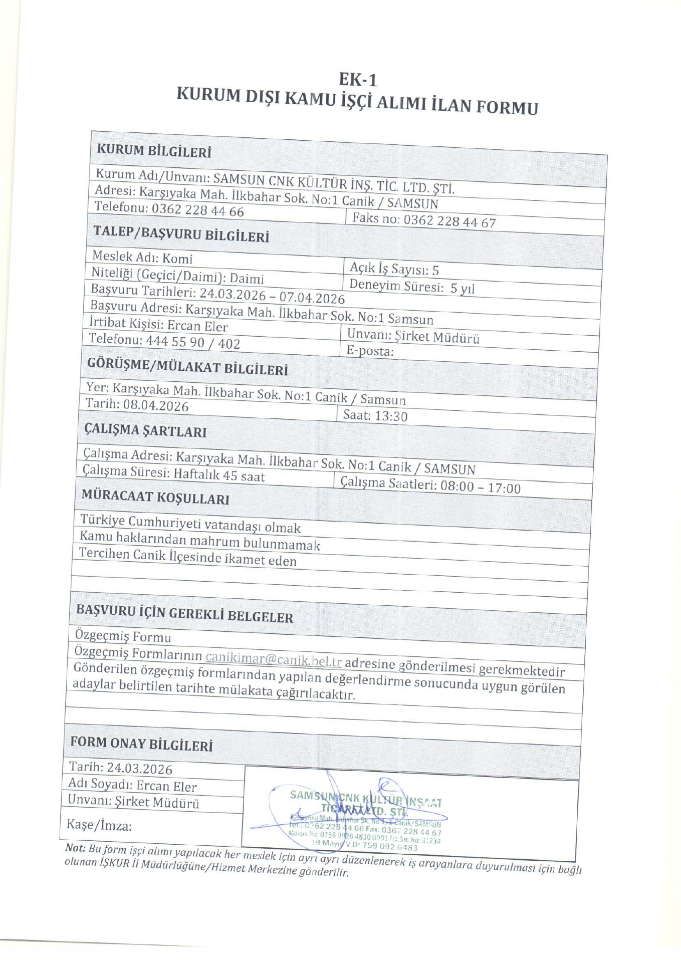 Ana sayfaDaimi İşçi İlanları Samsun CNK Kültür 18 İşçi Alacak Samsun CNK Kültür 18 İşçi Alacak. Son başvuru tarihi 7 Nisan 2026 Kaynak : İşkur İlan Giriş : 30 Mart 2026 22:23, Son Güncelleme : 30 Mart 2026 23:23 Yazdır Yorumlar (0) Abone Ol