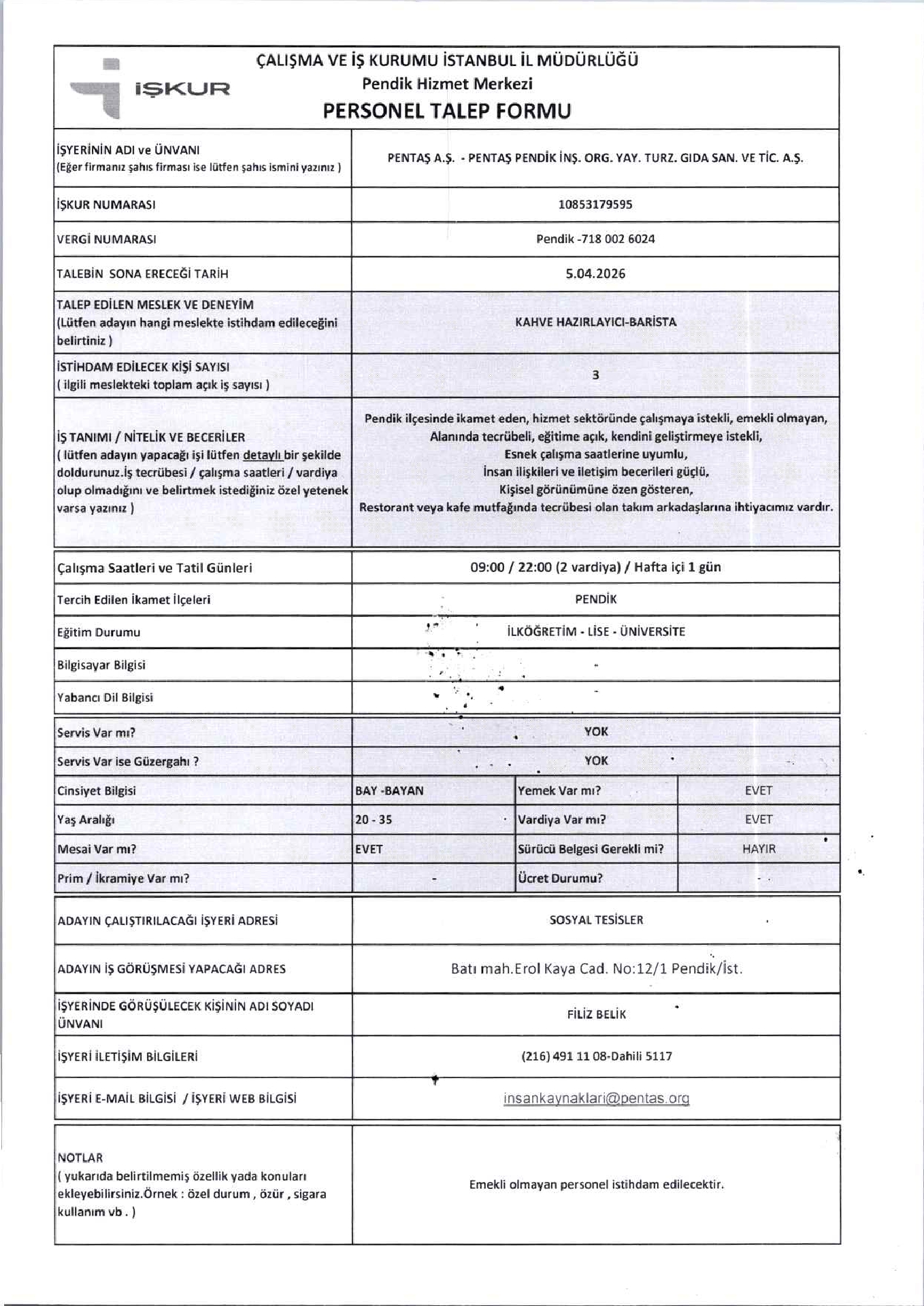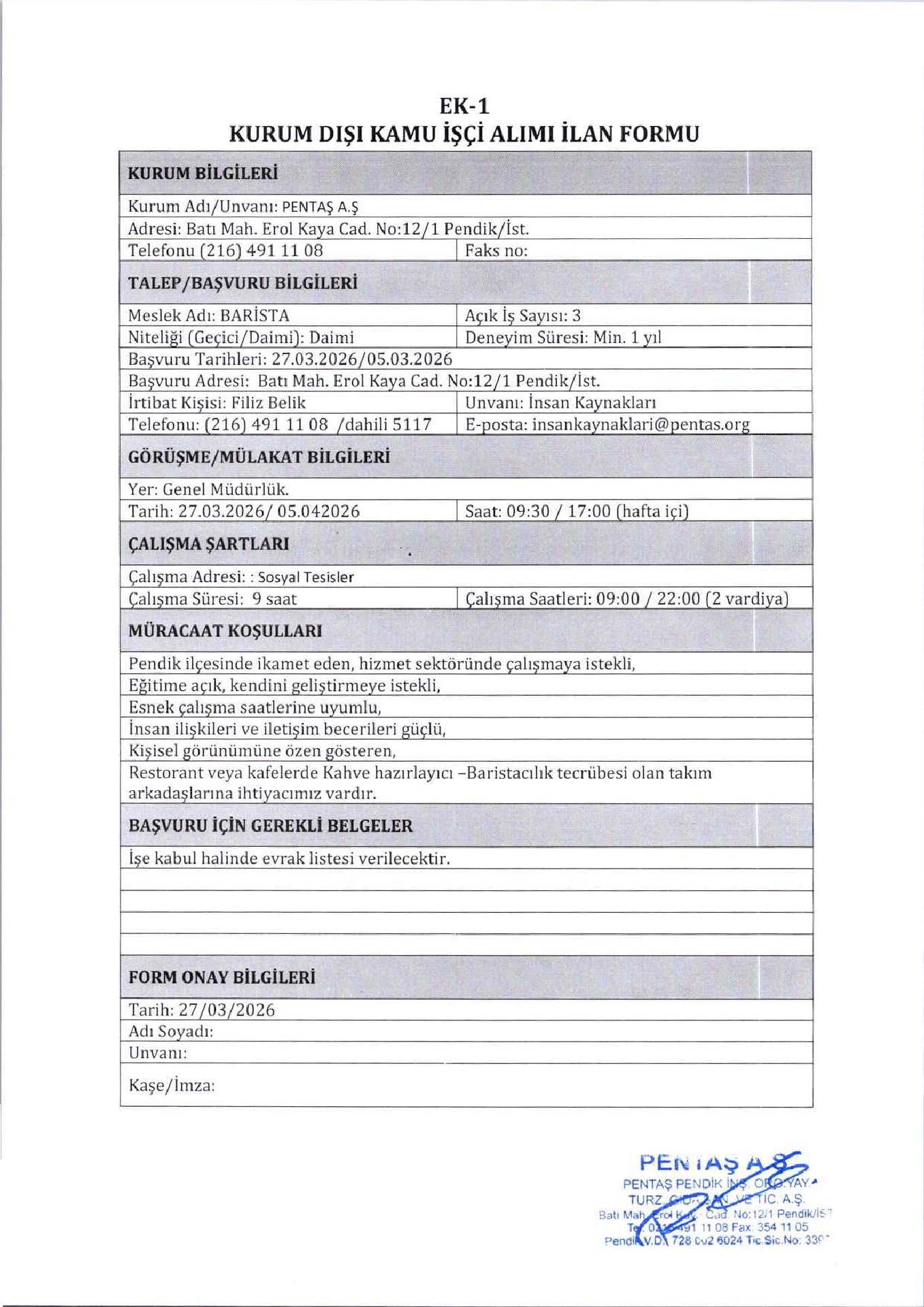 Ana sayfaDaimi İşçi İlanları Pendik Pentaş AŞ. 3 İşçi Alacak Pendik Pentaş AŞ. 3 İşçi Alacak. Son başvuru tarihi 5 Nisan 2026 Kaynak : İşkur İlan Giriş : 30 Mart 2026 22:48, Son Güncelleme : 30 Mart 2026 23:17 Yazdır Yorumlar (0) Abone Ol