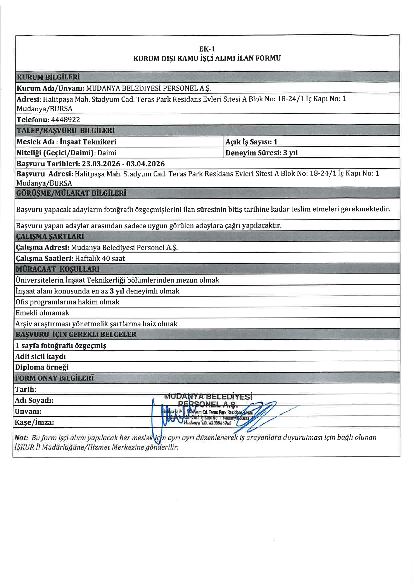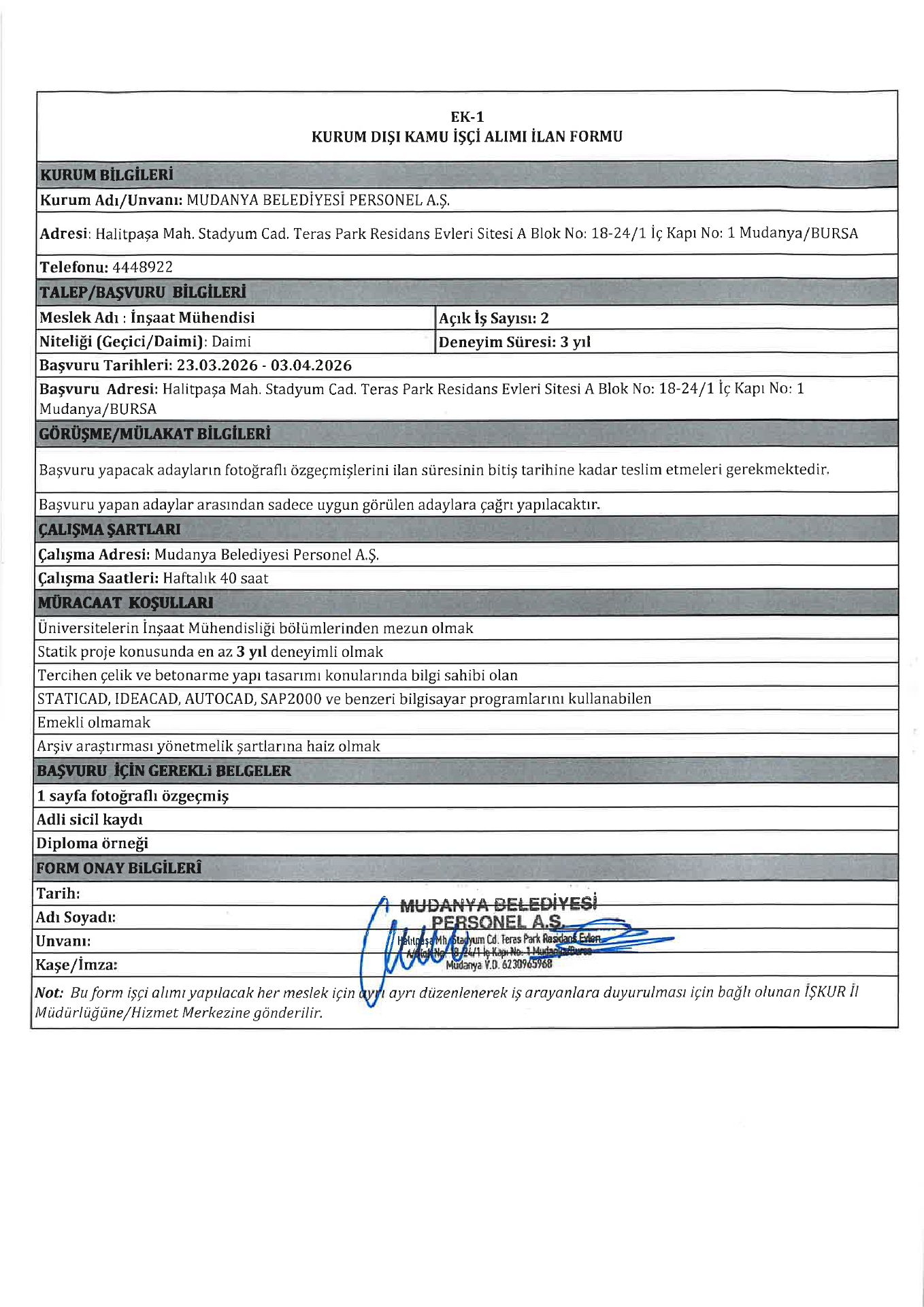 Ana sayfaDaimi İşçi İlanları Bursa Mudanya Belediyesi 3 İşçi Alacak Bursa Mudanya Belediyesi 3 İşçi Alacak. Son başvuru tarihi 3 Nisan 2026 Kaynak : İşkur İlan Giriş : 31 Mart 2026 22:59, Son Güncelleme : 31 Mart 2026 23:25 Yazdır Yorumlar (0) Abone Ol