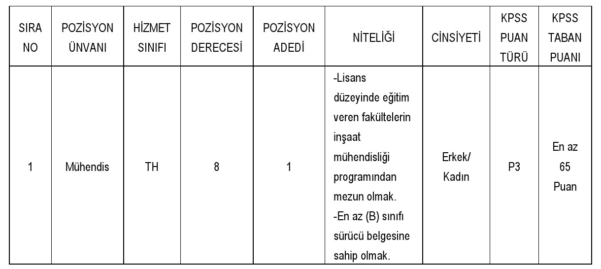 Nevşehir ili Yazıhüyük Belediye Başkanlığı bünyesinde 5393 sayılı Belediye Kanununun 49 uncu maddesi ile Mahalli İdarelere İlk Defa Atanacaklara Dair Sınav ve Atama Yönetmeliği hükümlerine göre aşağıda ünvanı, sınıfı, derecesi, adedi, nitelikleri, KPSS puan türü, KPSS taban puanı ve diğer şartları taşımak kaydıyla, belirtilen boş pozisyona tam zamanlı sözleşmeli personel alınacaktır.