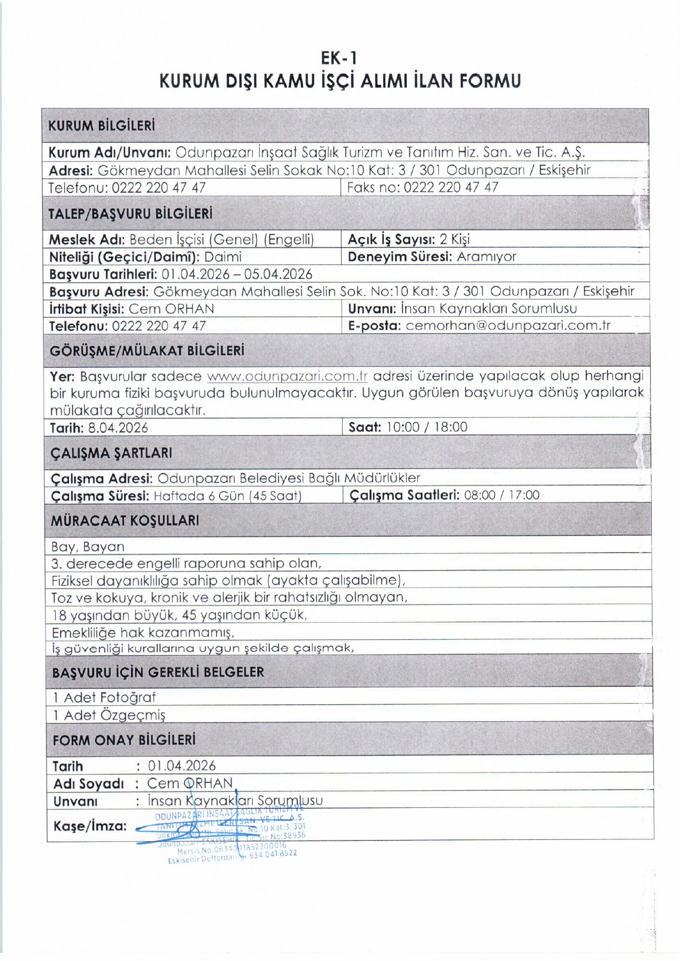 Ana sayfaDaimi İşçi İlanları Eskişehir Odunpazarı İnşaat 2 İşçi Alacak Eskişehir Odunpazarı İnşaat 2 İşçi Alacak. Son başvuru tarihi 5 Nisan 2026 Kaynak : İşkur İlan Giriş : 01 Nisan 2026 23:28, Son Güncelleme : 01 Nisan 2026 23:34 Yazdır Yorumlar (0) Abone Ol