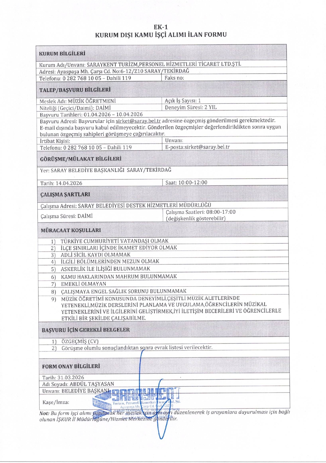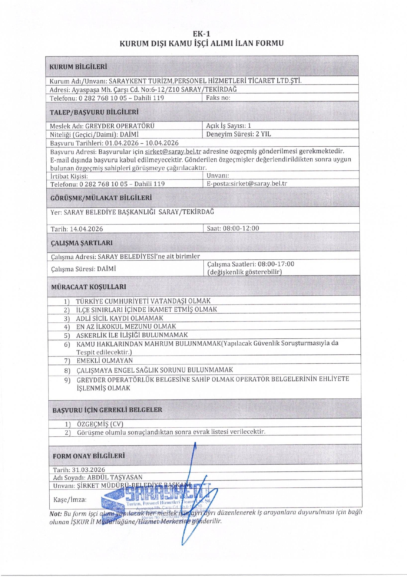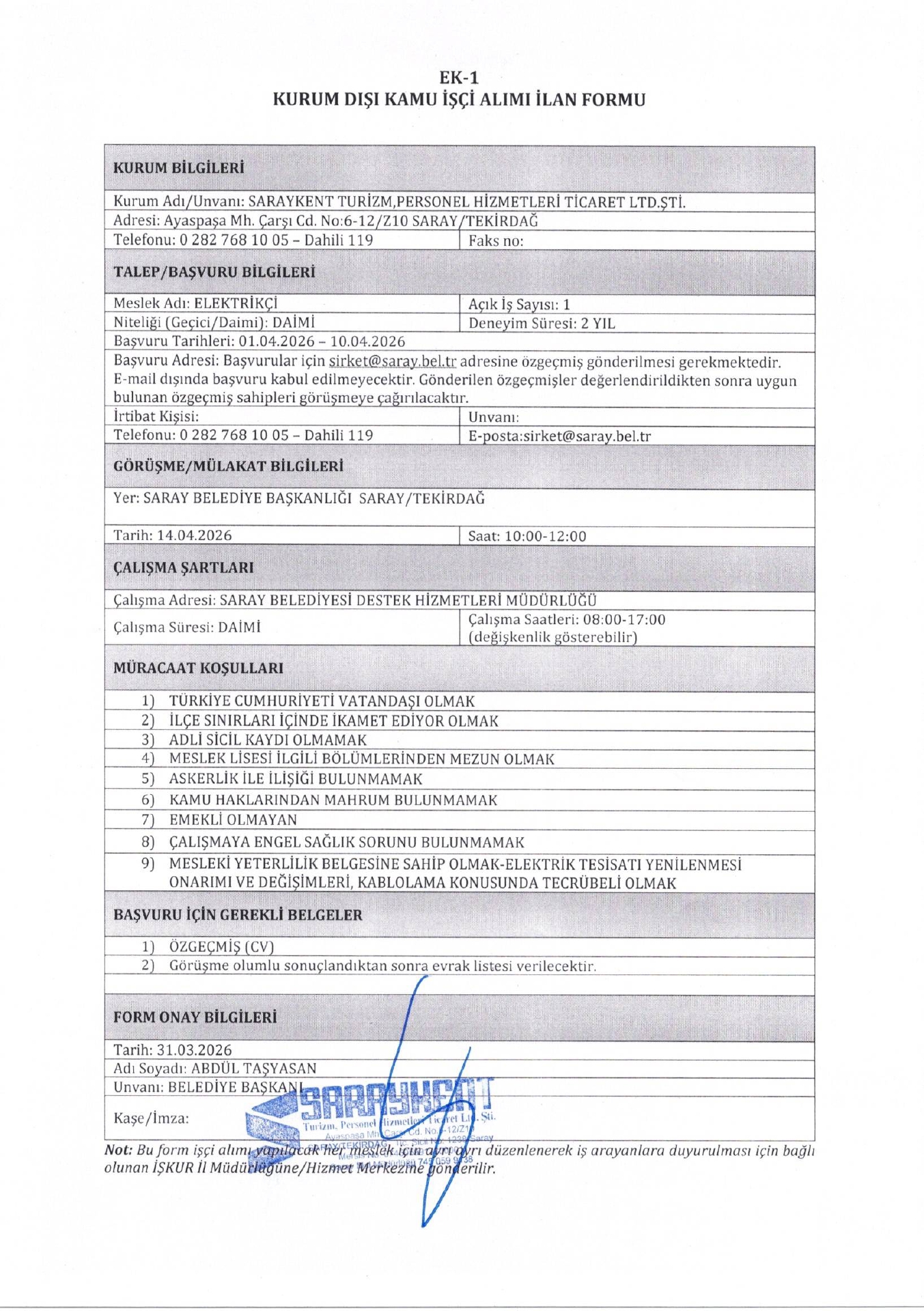 Ana sayfaDaimi İşçi İlanları Tekirdağ Saraykent Turizm 3 İşçi Alacak Tekirdağ Saraykent Turizm 3 İşçi Alacak. Son başvuru tarihi 10 Nisan 2026 Kaynak : İşkur İlan Giriş : 01 Nisan 2026 23:32, Son Güncelleme : 01 Nisan 2026 23:33 Yazdır Yorumlar (0) Abone Ol