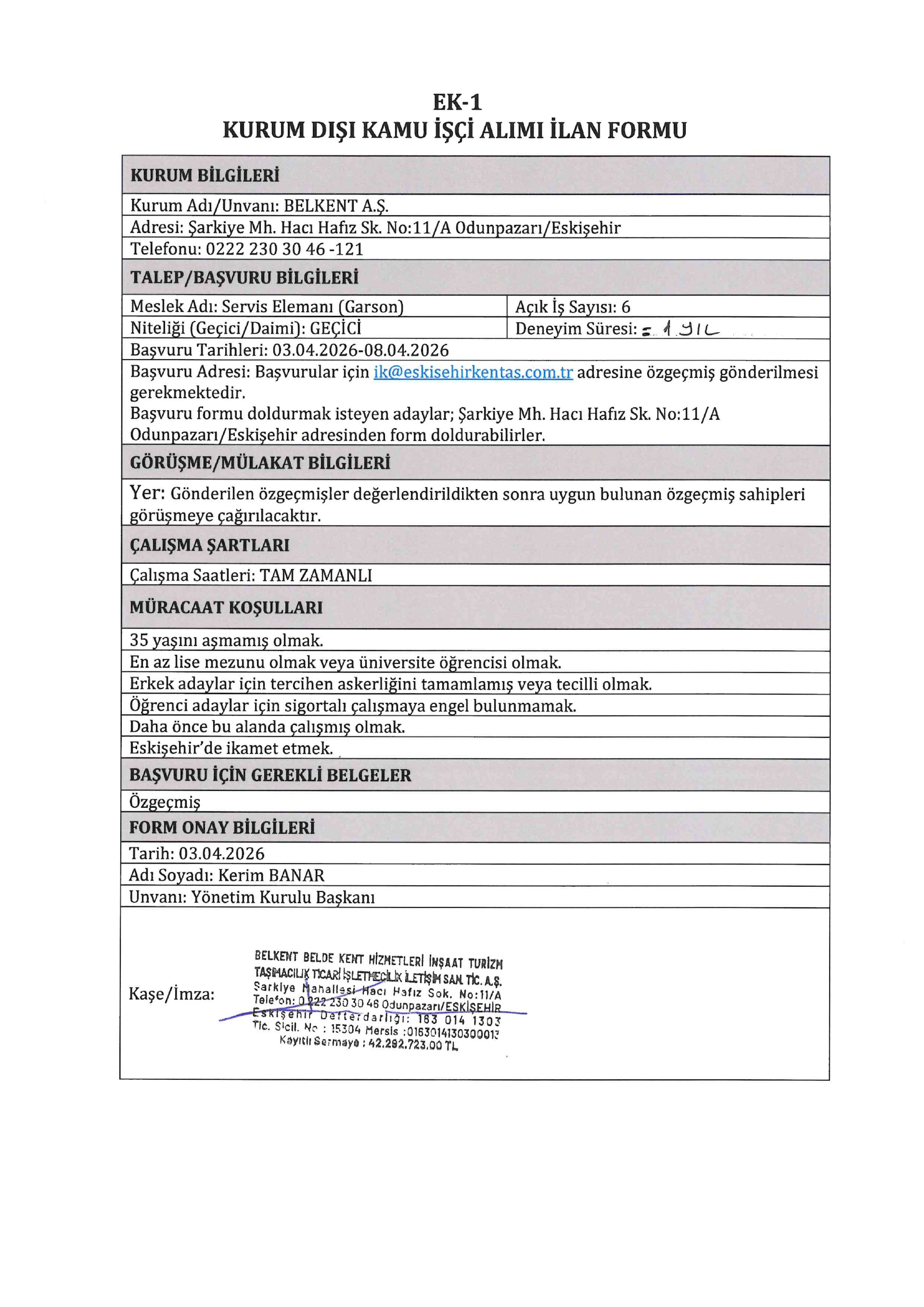 Ana sayfaGeçici İşçi İlanları Eskişehir Belkent Geçici 6 İşçi Alacak Eskişehir Belkent Geçici 6 İşçi Alacak. Son başvuru tarihi 8 Nisan 2026 Kaynak : İşkur İlan Giriş : 03 Nisan 2026 23:52, Son Güncelleme : 04 Nisan 2026 00:22 Yazdır Yorumlar (0) Abone Ol