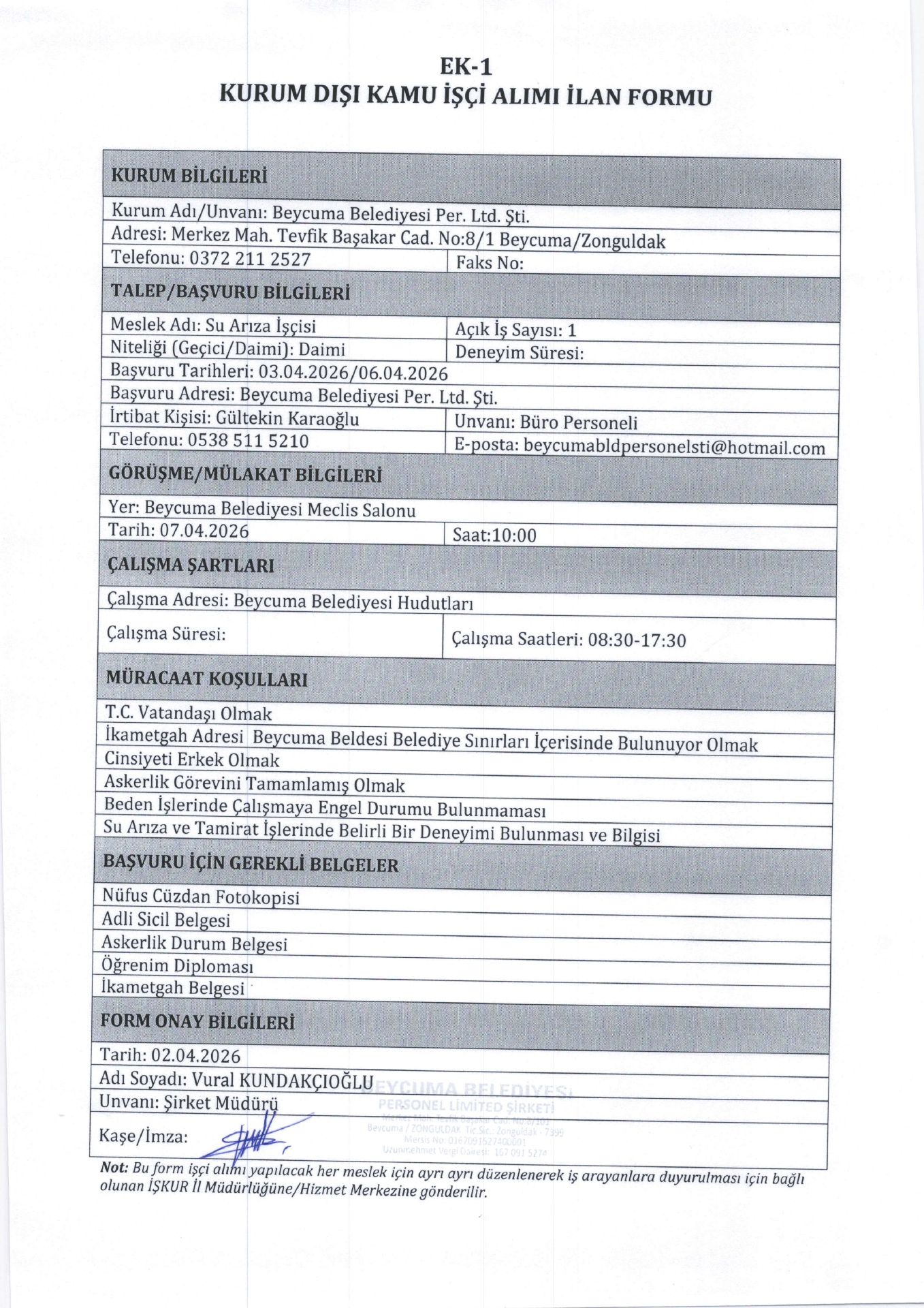 Ana sayfaDaimi İşçi İlanları Zonguldak Baycuma Belediyesi 1 İşçi Alacak Zonguldak Baycuma Belediyesi 1 İşçi Alacak. Son başvuru tarihi 6 Nisan 2026 Kaynak : İşkur İlan Giriş : 03 Nisan 2026 23:55, Son Güncelleme : 04 Nisan 2026 00:22 Yazdır Yorumlar (0) Abone Ol