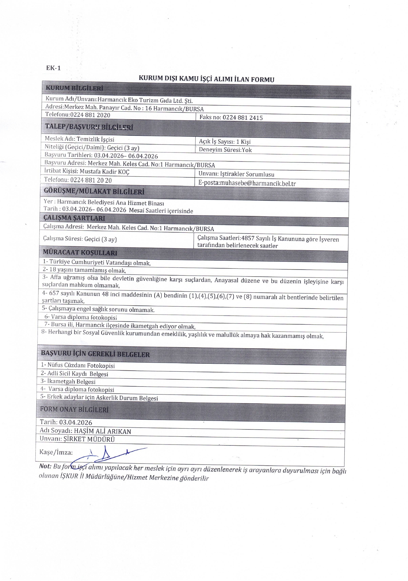 Ana sayfaGeçici İşçi İlanları Bursa Harmancık Esko Turizm Geçici 1 İşçi Alacak Bursa Harmancık Esko Turizm Geçici 1 İşçi Alacak. Son başvuru tarihi 6 Nisan 2026 Kaynak : İşkur İlan Giriş : 04 Nisan 2026 00:08, Son Güncelleme : 04 Nisan 2026 00:18 Yazdır Yorumlar (0) Abone Ol
