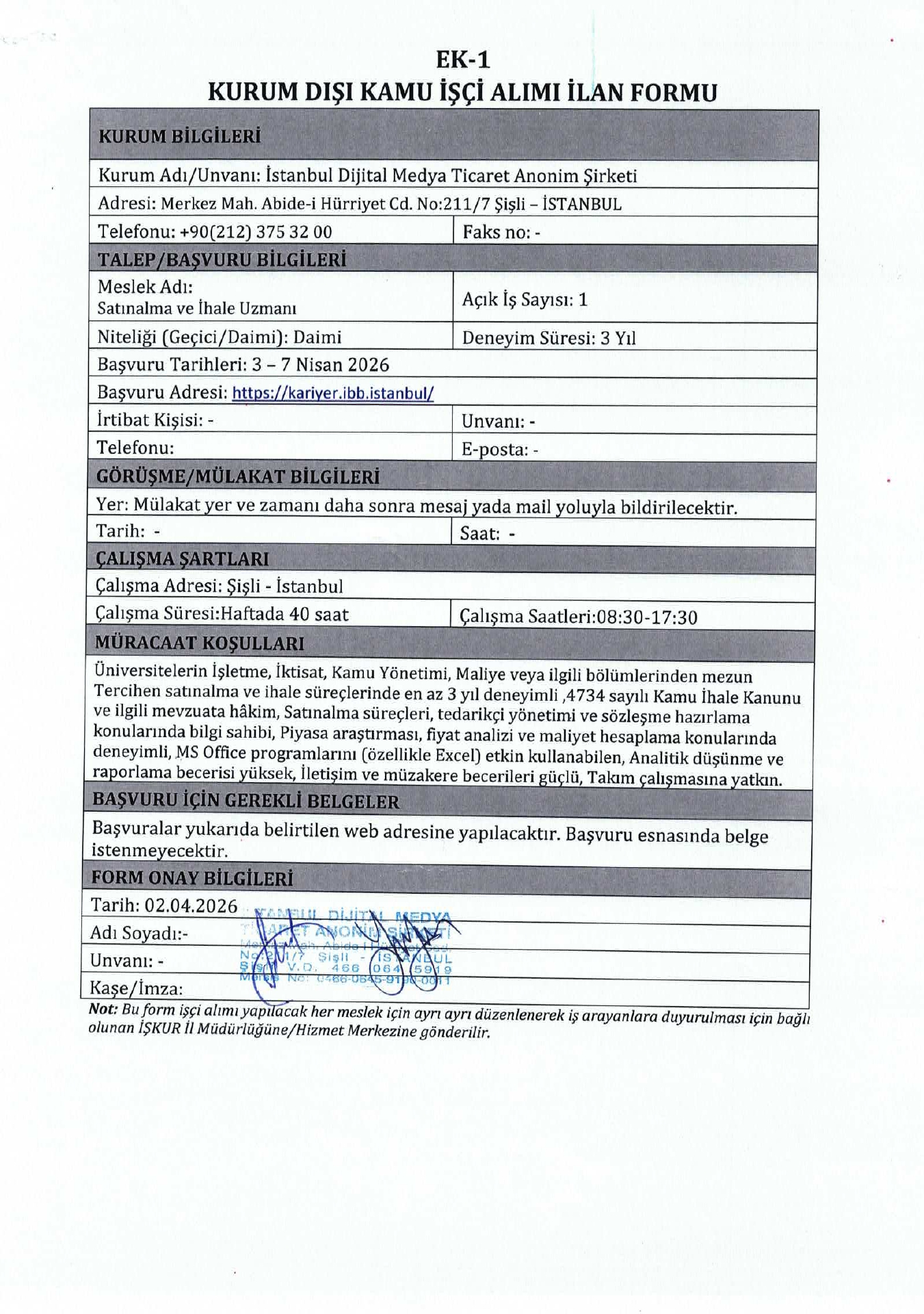 Ana sayfaDaimi İşçi İlanları İstanbul Dijital Medya 1 İşçi Alacak İstanbul Dijital Medya 1 İşçi Alacak. Son başvuru tarihi 7 Nisan 2026 Kaynak : İşkur İlan Giriş : 04 Nisan 2026 00:12, Son Güncelleme : 04 Nisan 2026 00:18 Yazdır Yorumlar (0) Abone Ol
