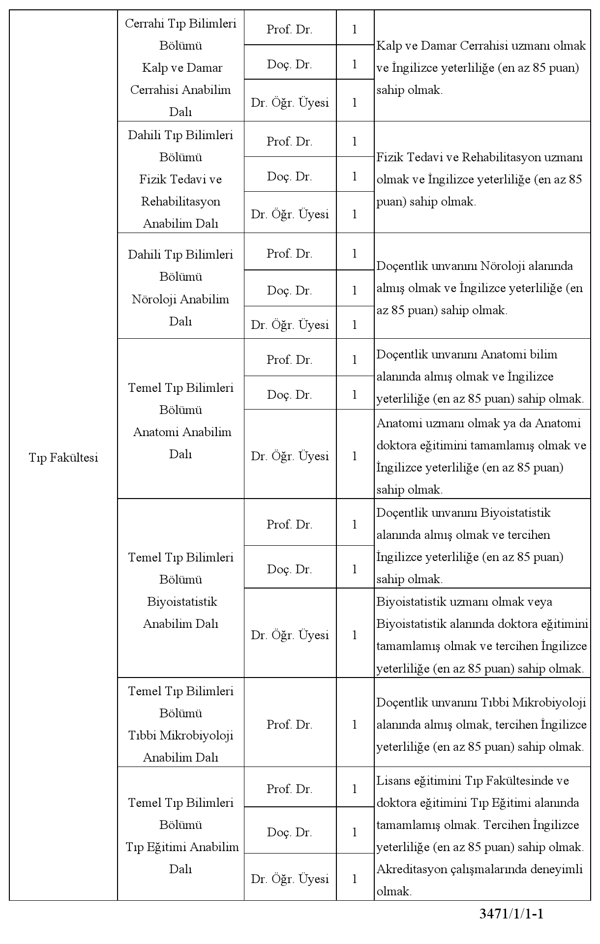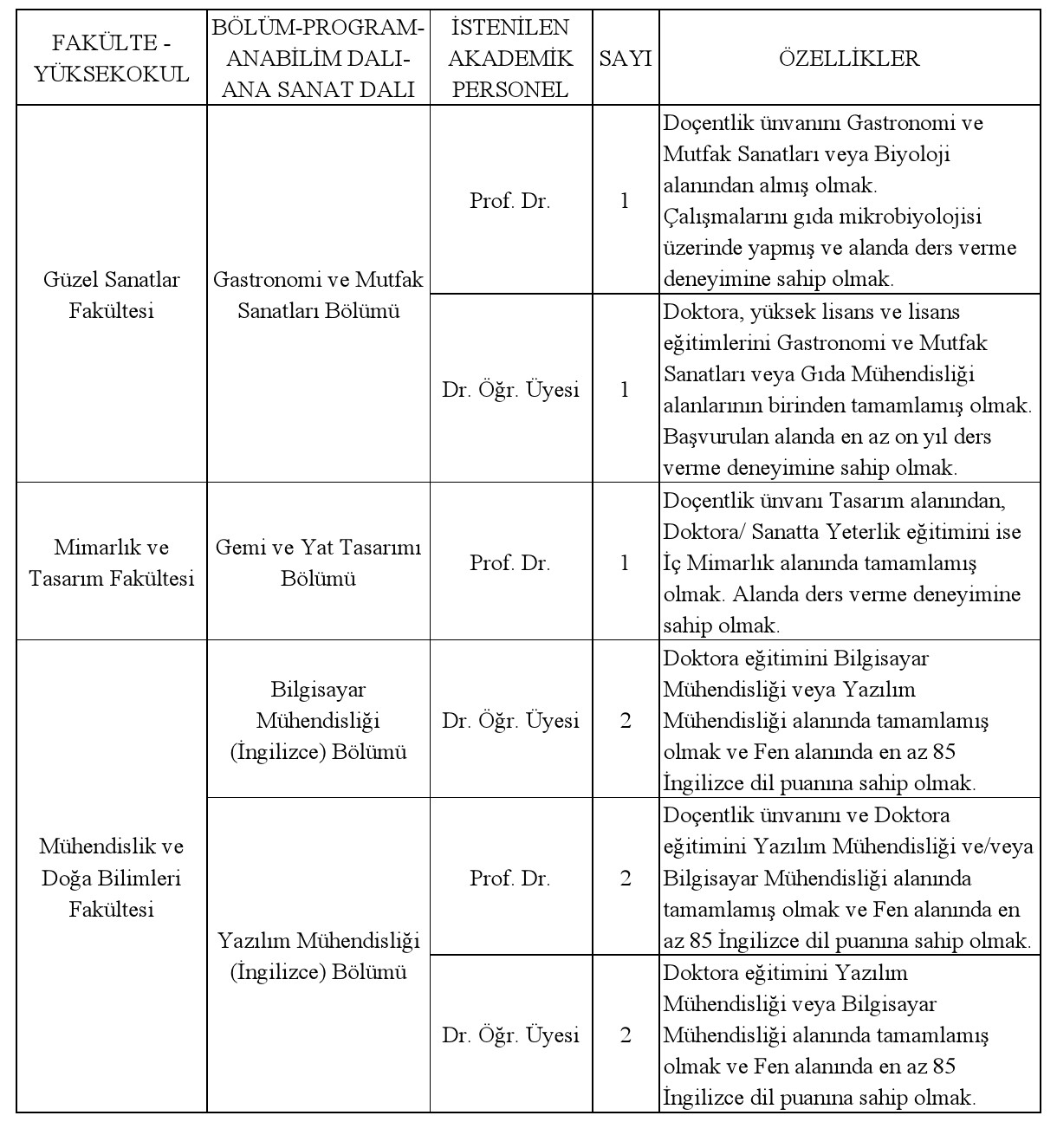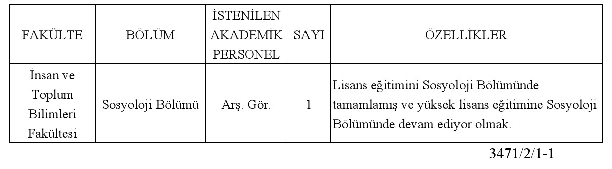 Not: Adayların ilan tarihini izleyen 15 gün içinde Personel ve İdari İşler Daire Başkanlığına şahsen veya postayla başvurmaları gerekmektedir. Son başvuru tarihinden sonra ve eksik belgeyle yapılan başvurular geçersiz sayılacaktır.
