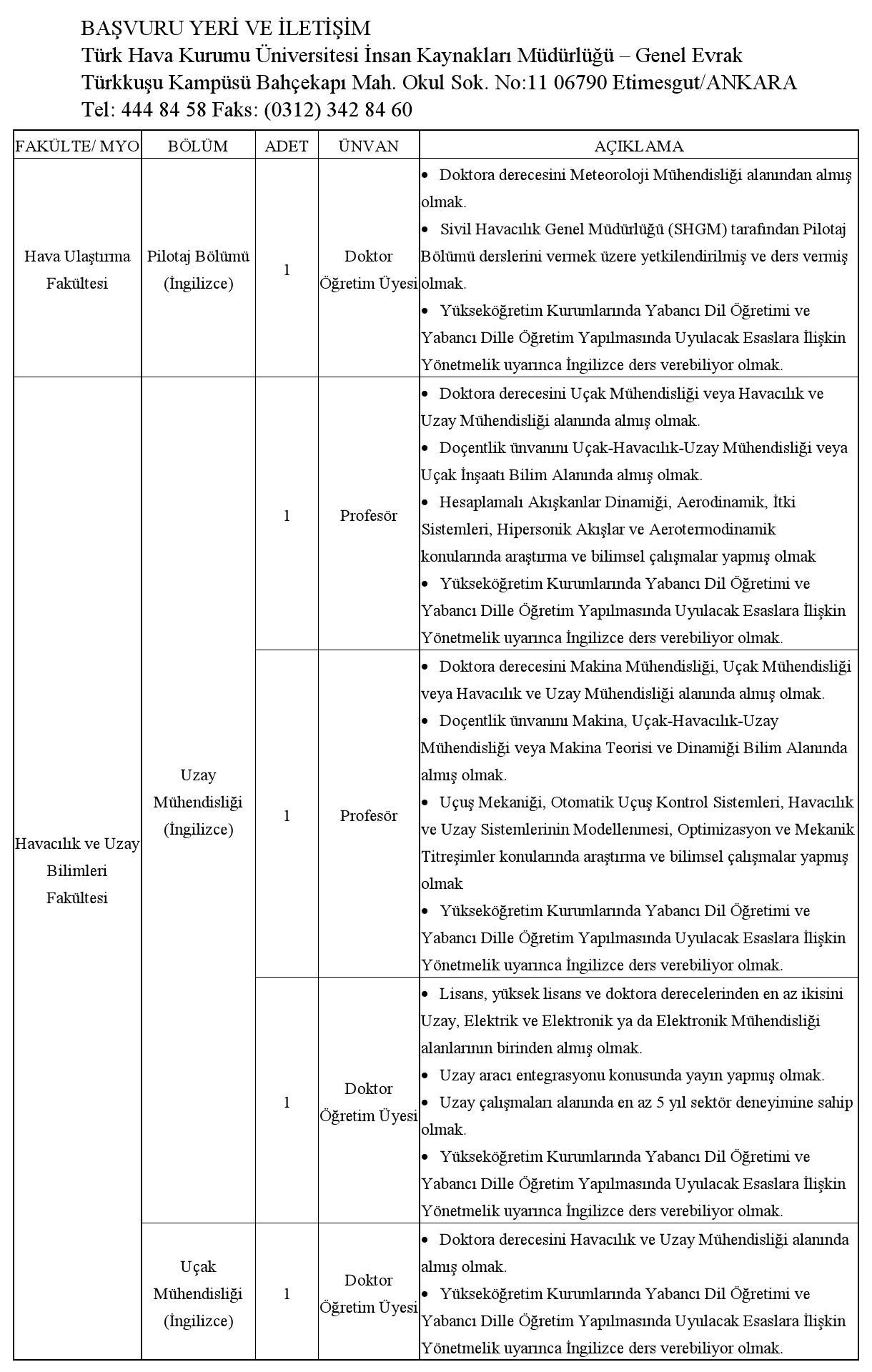 Türk Hava Kurumu Üniversitesi İnsan Kaynakları Müdürlüğü - Genel Evrak Türkkuşu Kampüsü Bahçekapı Mah. Okul Sok. No:11 06790 Etimesgut/ANKARA