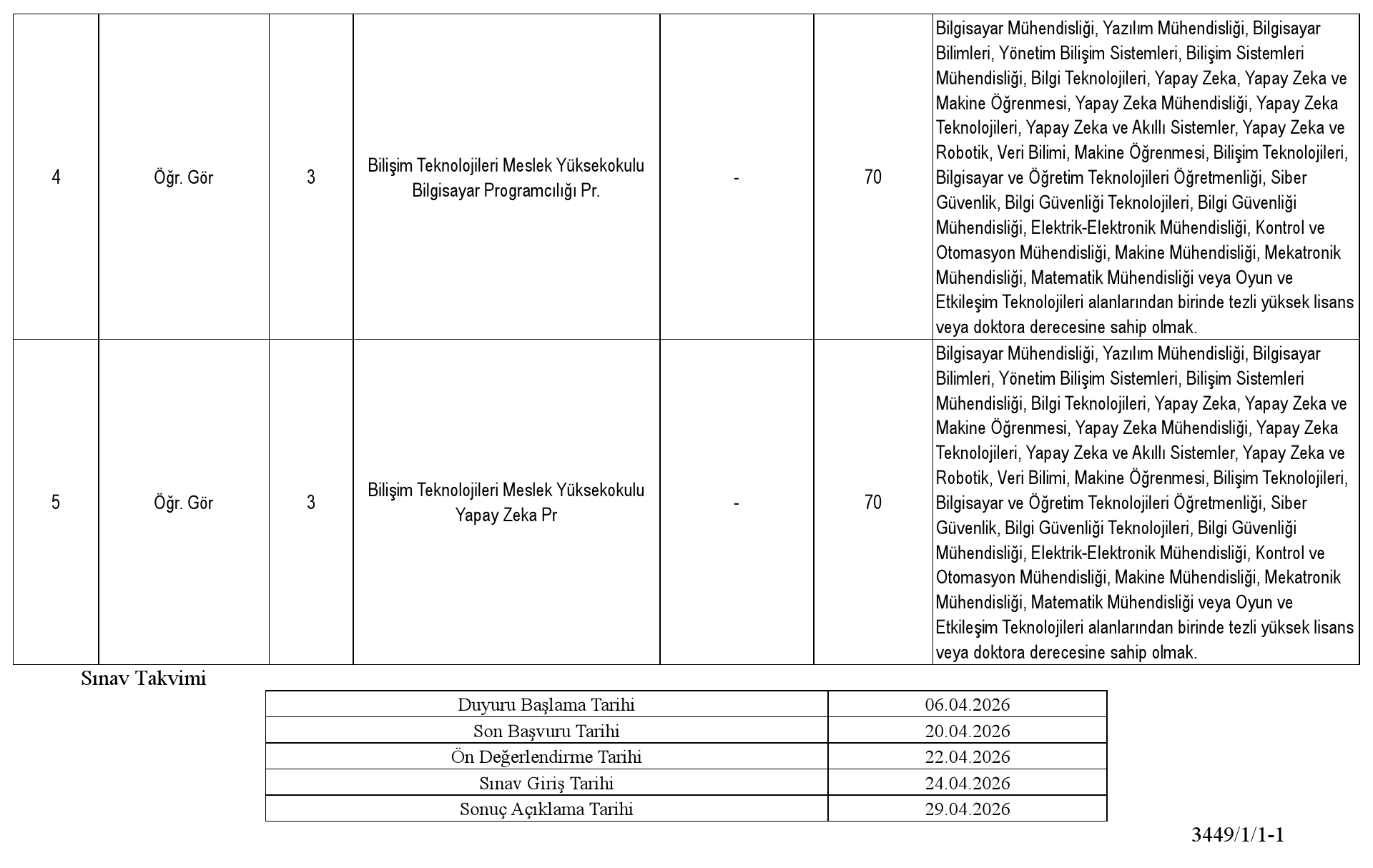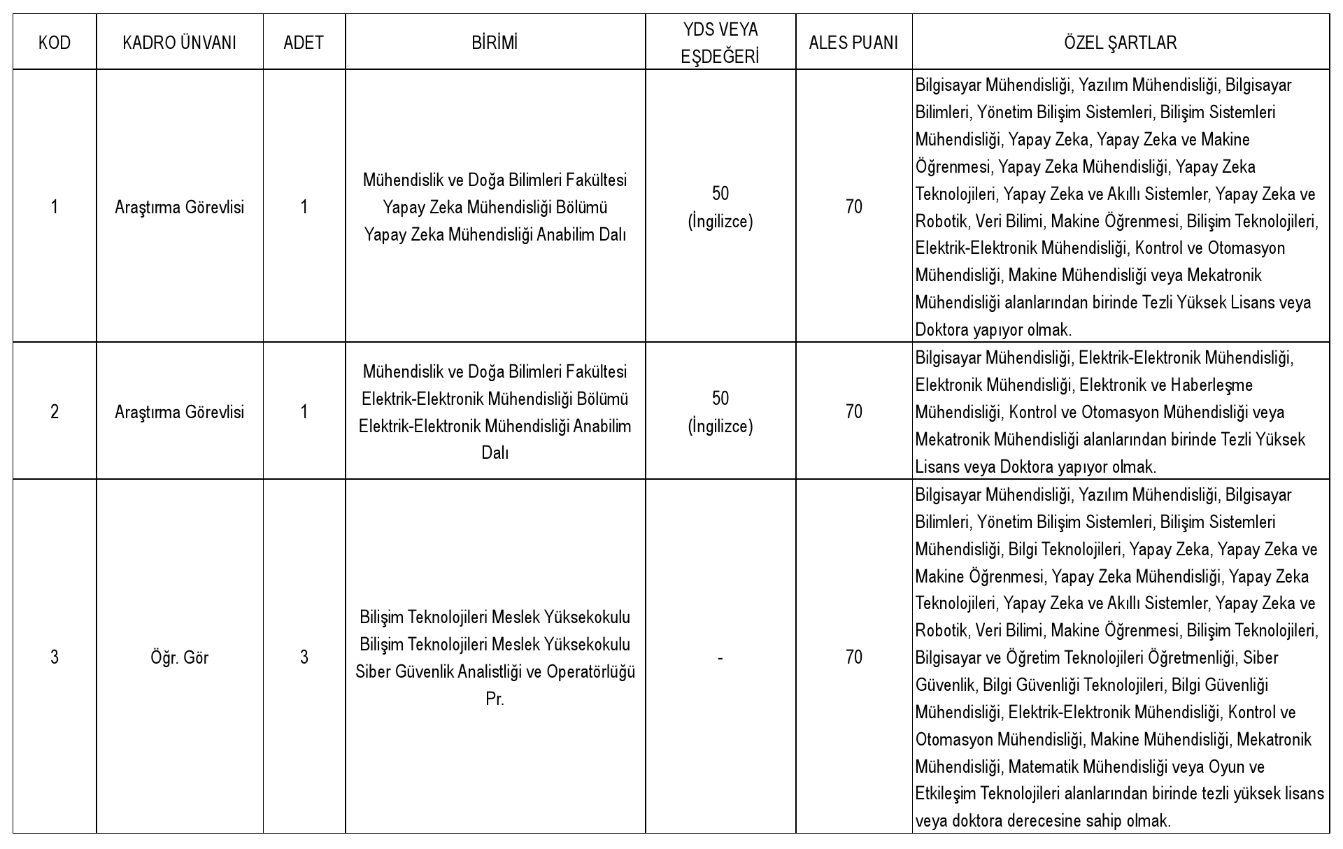 7- Atama yapılacak programın Lisans eğitimine hangi alanda öğrenci alınıyorsa o alanda ALES Sonuç Belgesi.