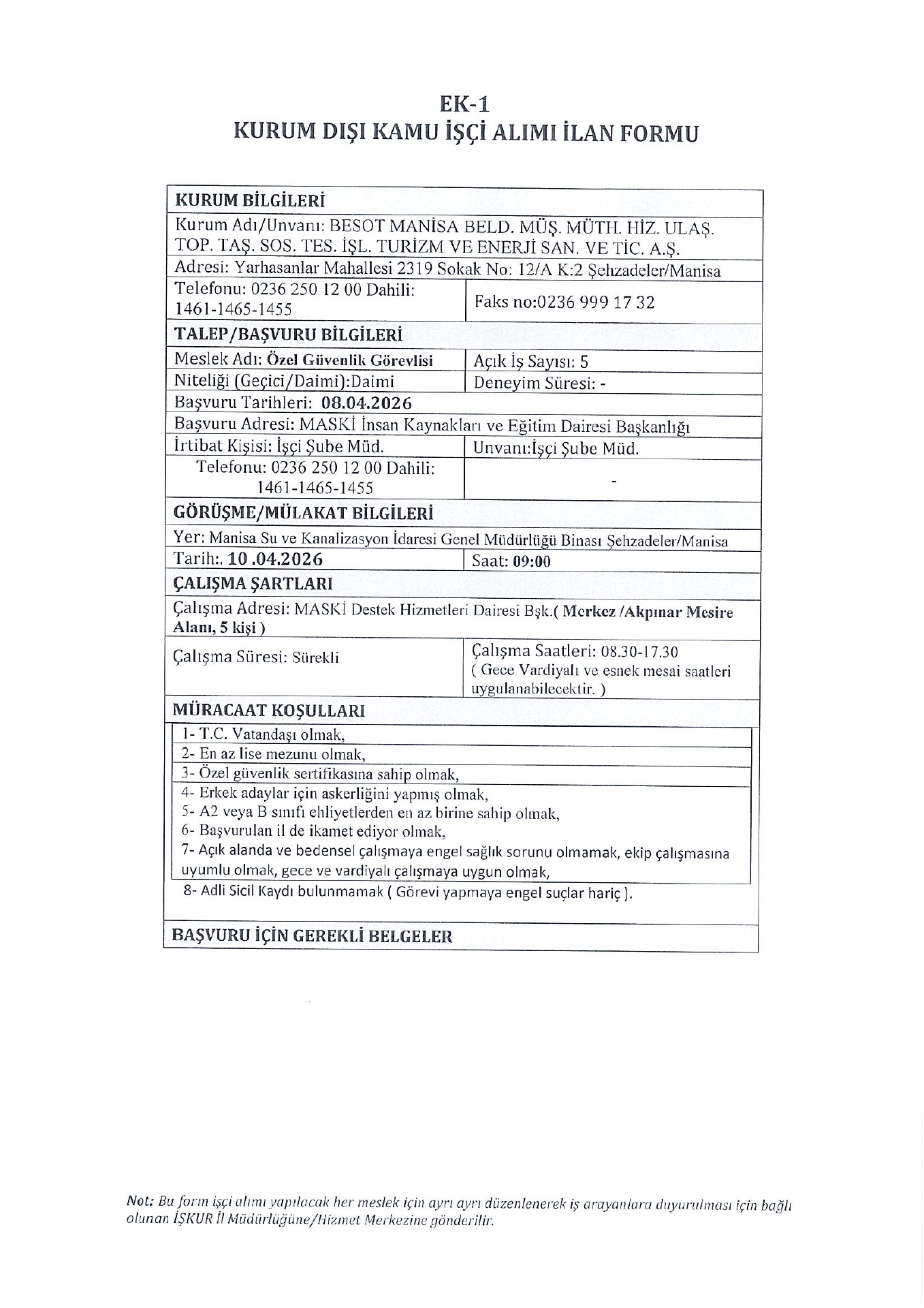 Manisa Besot 5 İşçi Alacak. Son başvuru tarihi 8 Nisan 2026