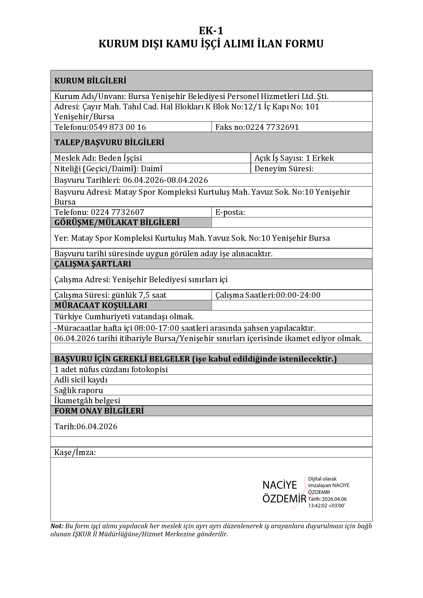 Bursa Yenişehir Belediyesi 1 İşçi Alacak. Son başvuru tarihi 8 Nisan 2026