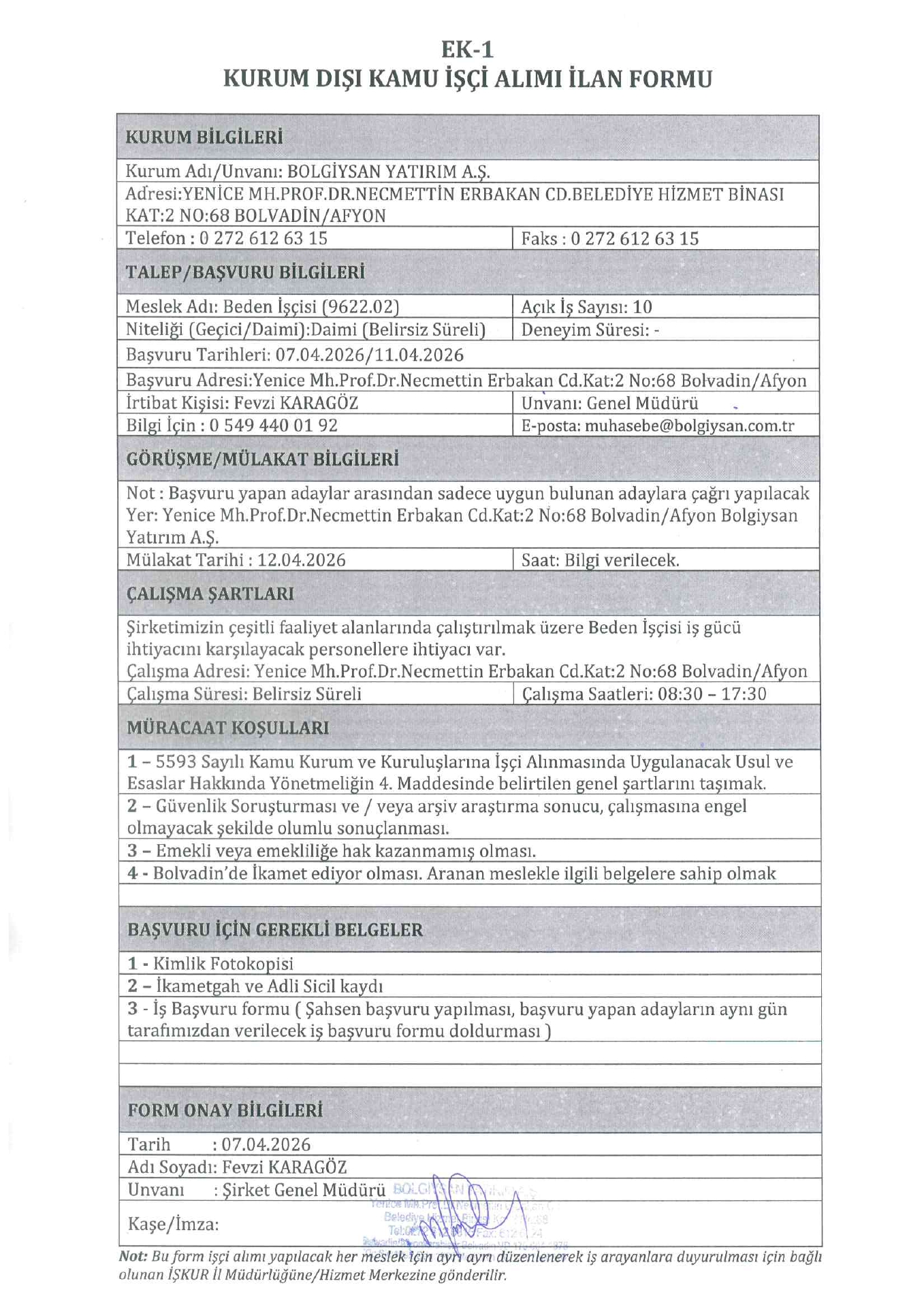 Ana sayfaDaimi İşçi İlanları Afyonkarahisar Bolgiysan 10 İşçi Alacak Afyonkarahisar Bolgiysan 10 İşçi Alacak. Son başvuru tarihi 11 Nisan 2026 Kaynak : İşkur İlan Giriş : 07 Nisan 2026 22:34, Son Güncelleme : 07 Nisan 2026 23:42 Yazdır Yorumlar (0) Abone Ol