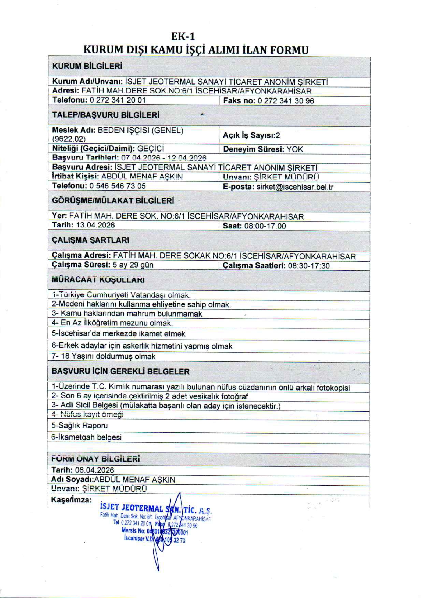 Ana sayfaGeçici İşçi İlanları Afyonkarahisar İsjet Geçici 2 İşçi Alacak Afyonkarahisar İsjet Geçici 2 İşçi Alacak. Son başvuru tarihi 12 Nisan 2026 Kaynak : İşkur İlan Giriş : 07 Nisan 2026 22:37, Son Güncelleme : 07 Nisan 2026 23:41 Yazdır Yorumlar (0) Abone Ol
