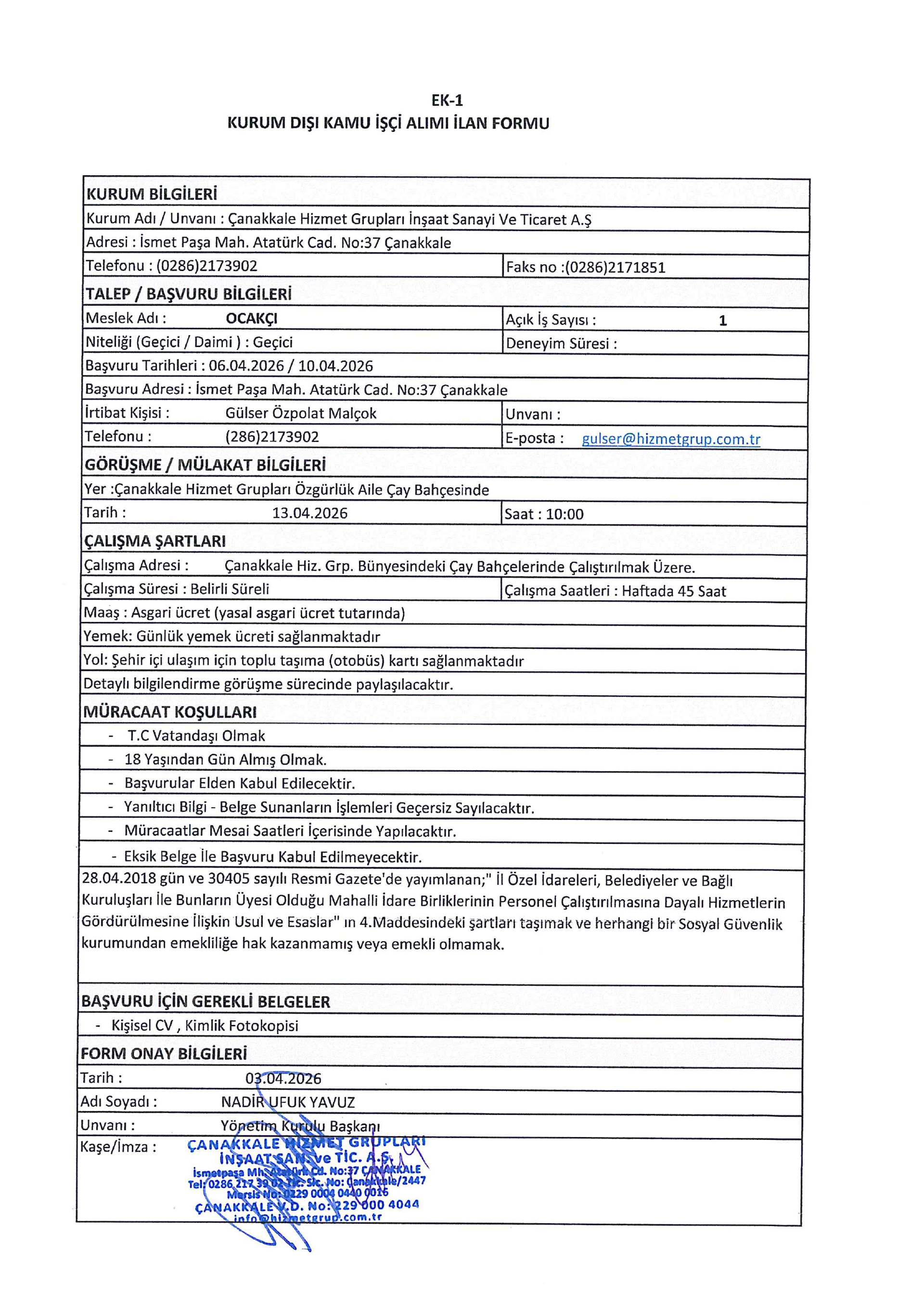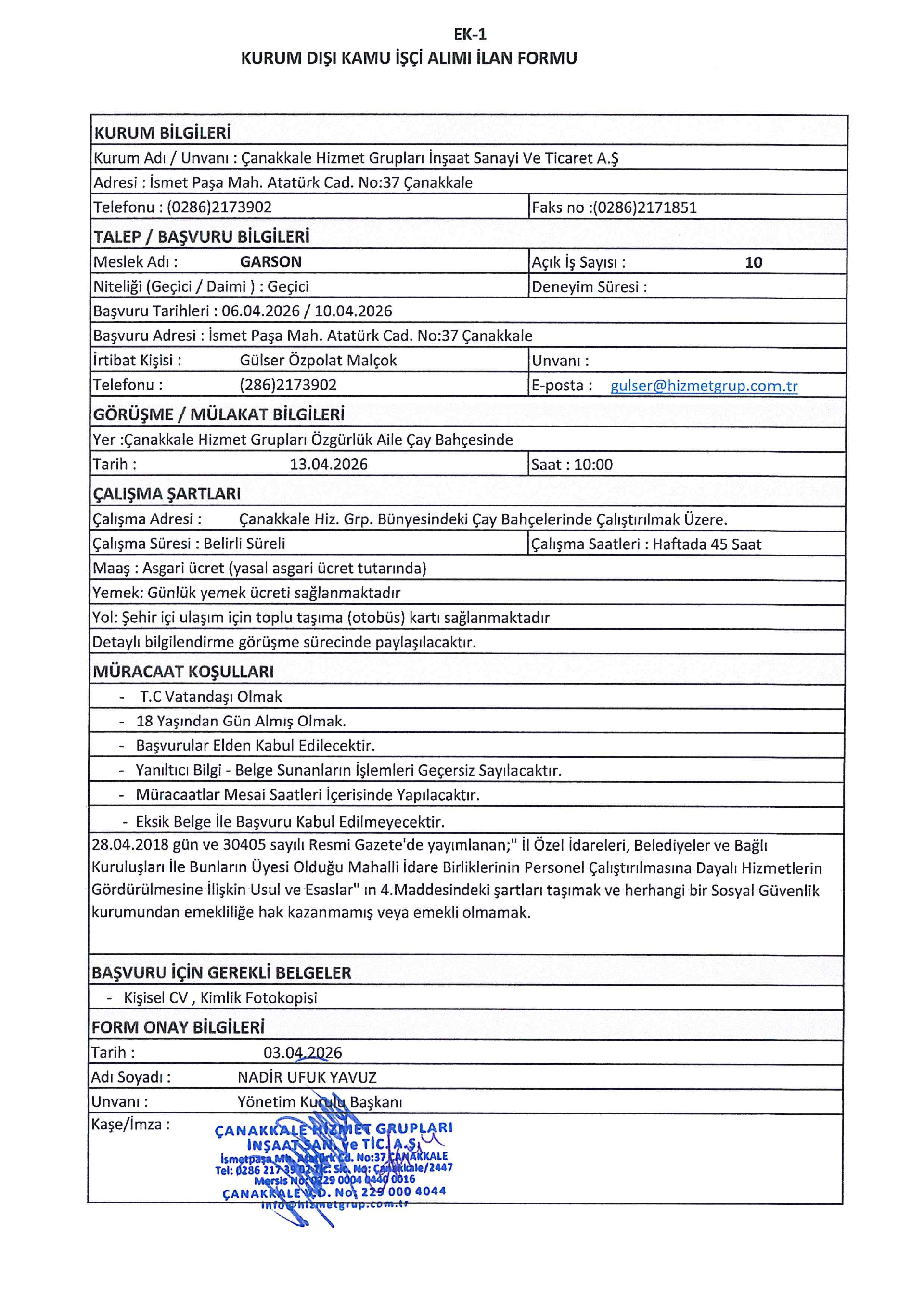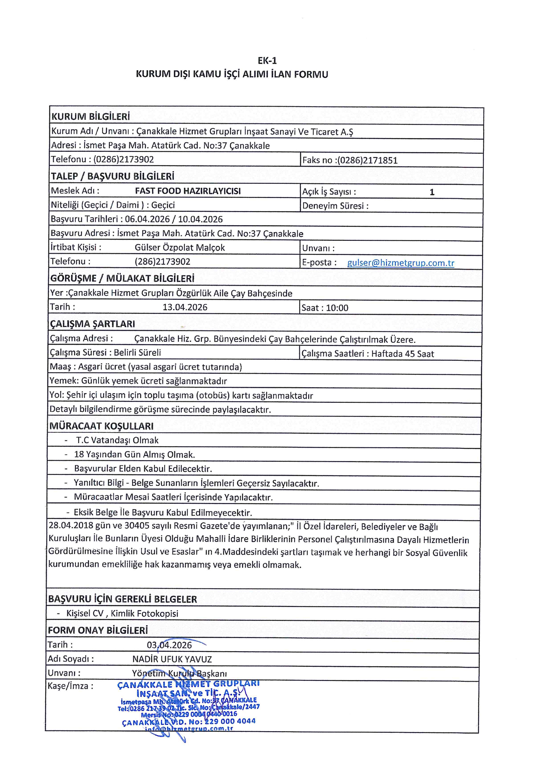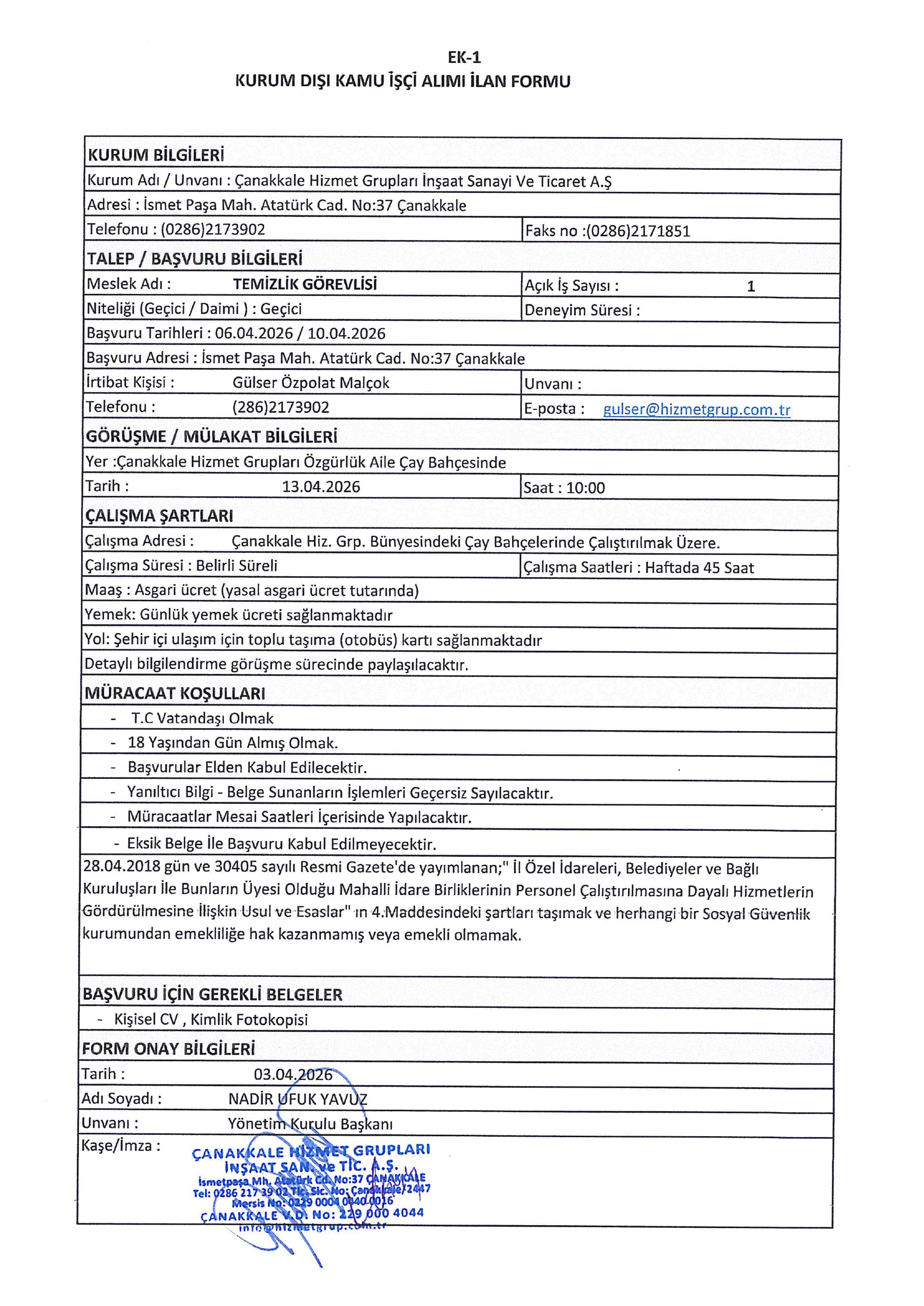 Ana sayfaGeçici İşçi İlanları Çanakkale Hizmet Grupları Geçici 13 İşçi Alacak Çanakkale Hizmet Grupları Geçici 13 İşçi Alacak. Son başvuru tarihi 10 Nisan 2026 Kaynak : İşkur İlan Giriş : 07 Nisan 2026 22:46, Son Güncelleme : 07 Nisan 2026 23:39 Yazdır Yorumlar (0) Abone Ol