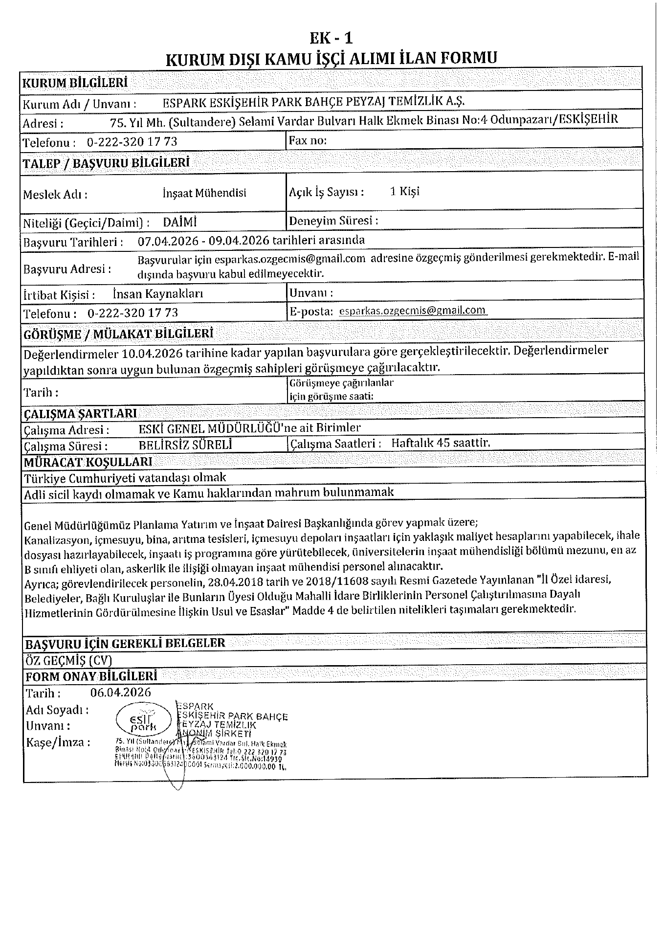Eskişehir Espark 1 İşçi Alacak. Son başvuru tarihi 9 Nisan 2026