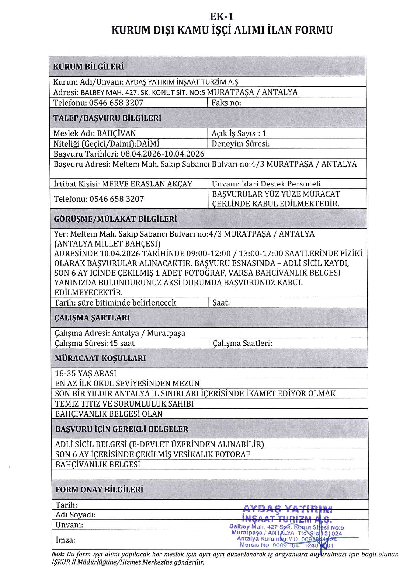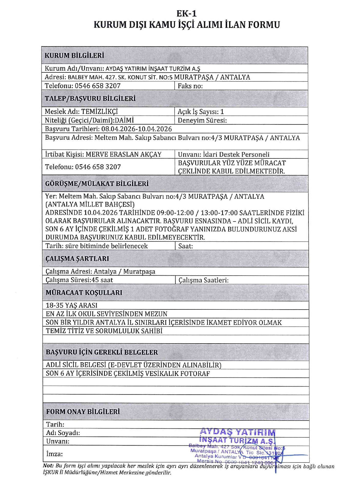 Antalya Aydaş 2 İşçi Alacak. Son başvuru tarihi 10 Nisan 2026