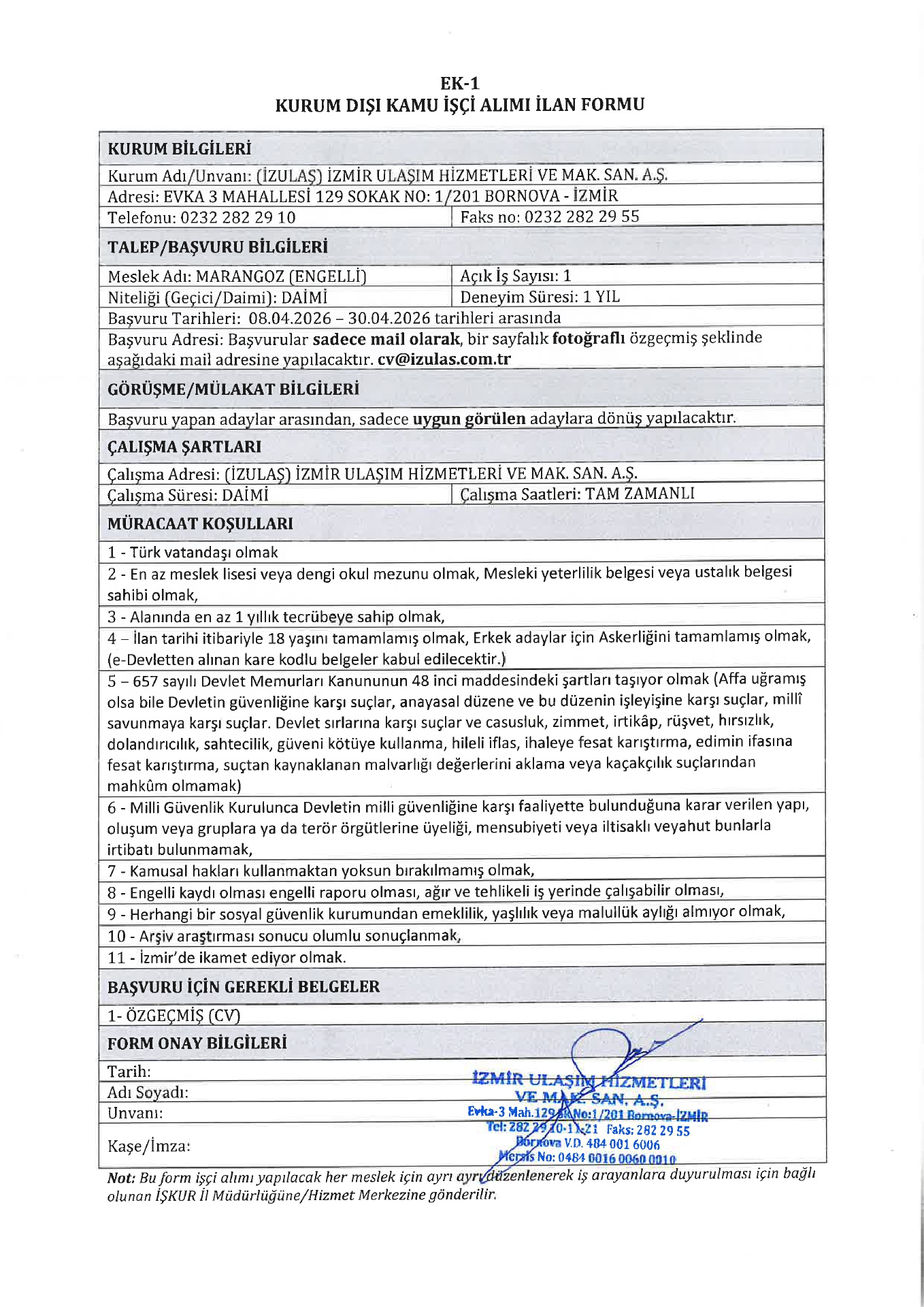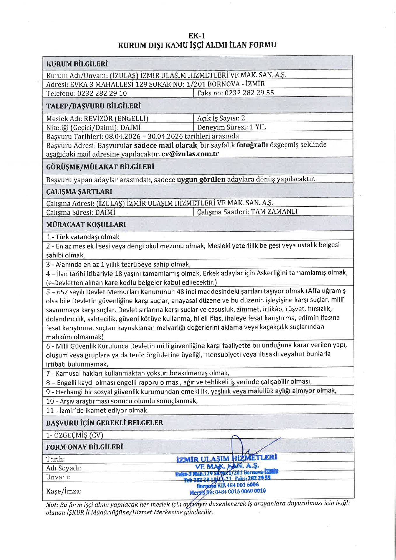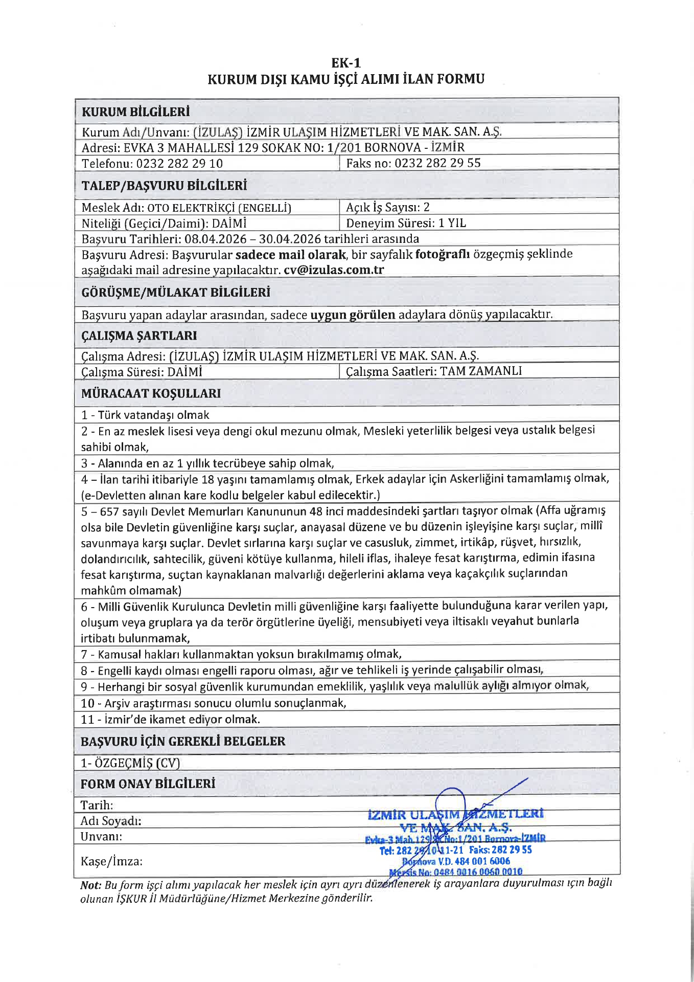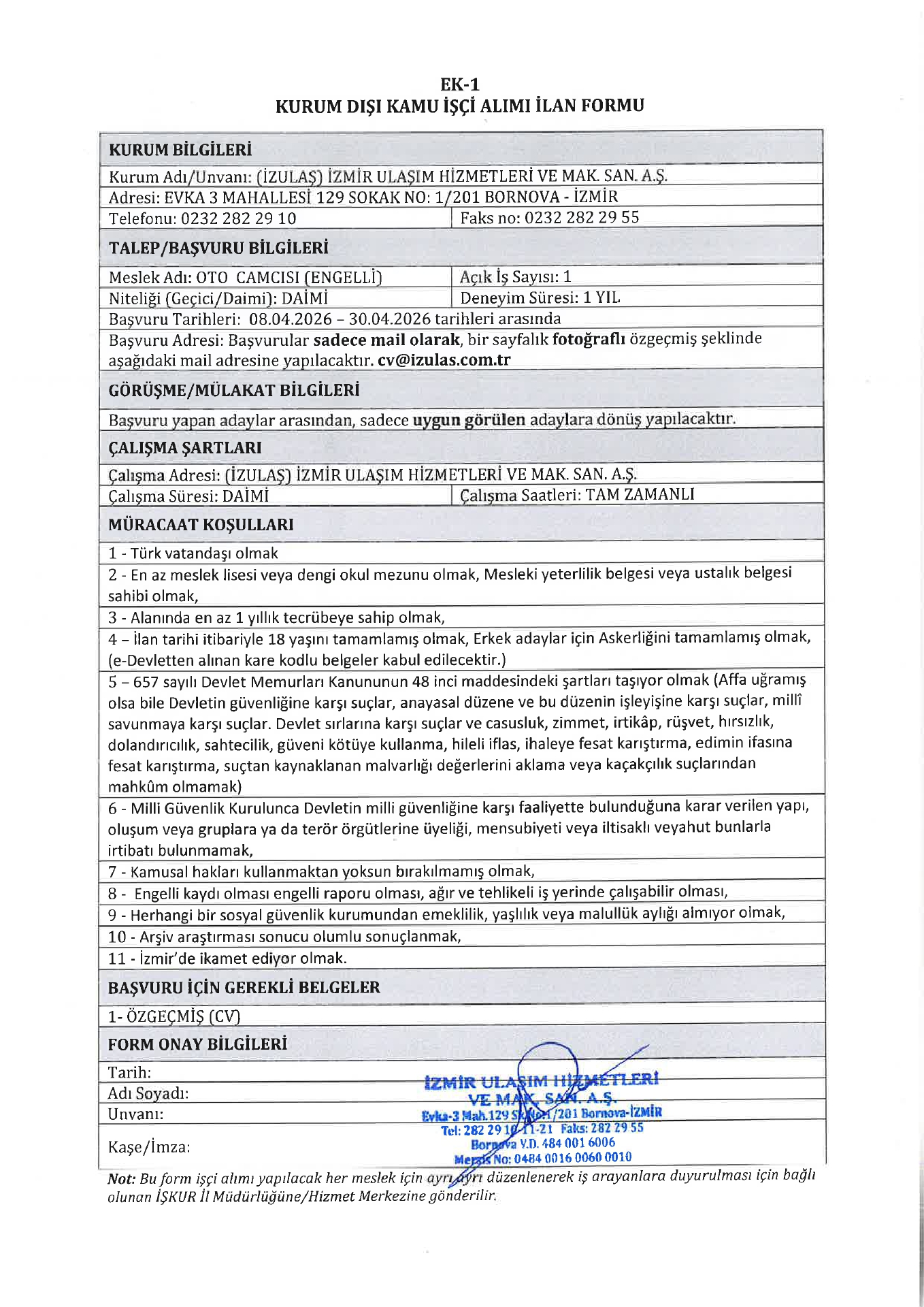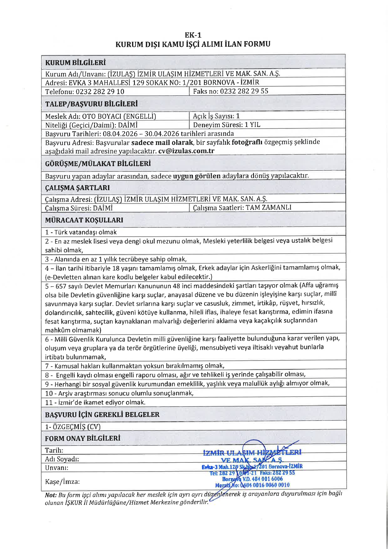 Ana sayfaDaimi İşçi İlanları İzmir İzulaş 7 İşçi Alacak İzmir İzulaş 7 İşçi Alacak. Son başvuru tarihi 30 Nisan 2026 Kaynak : İşkur İlan Giriş : 08 Nisan 2026 23:18, Son Güncelleme : 08 Nisan 2026 23:44 Yazdır Yorumlar (0) Abone Ol