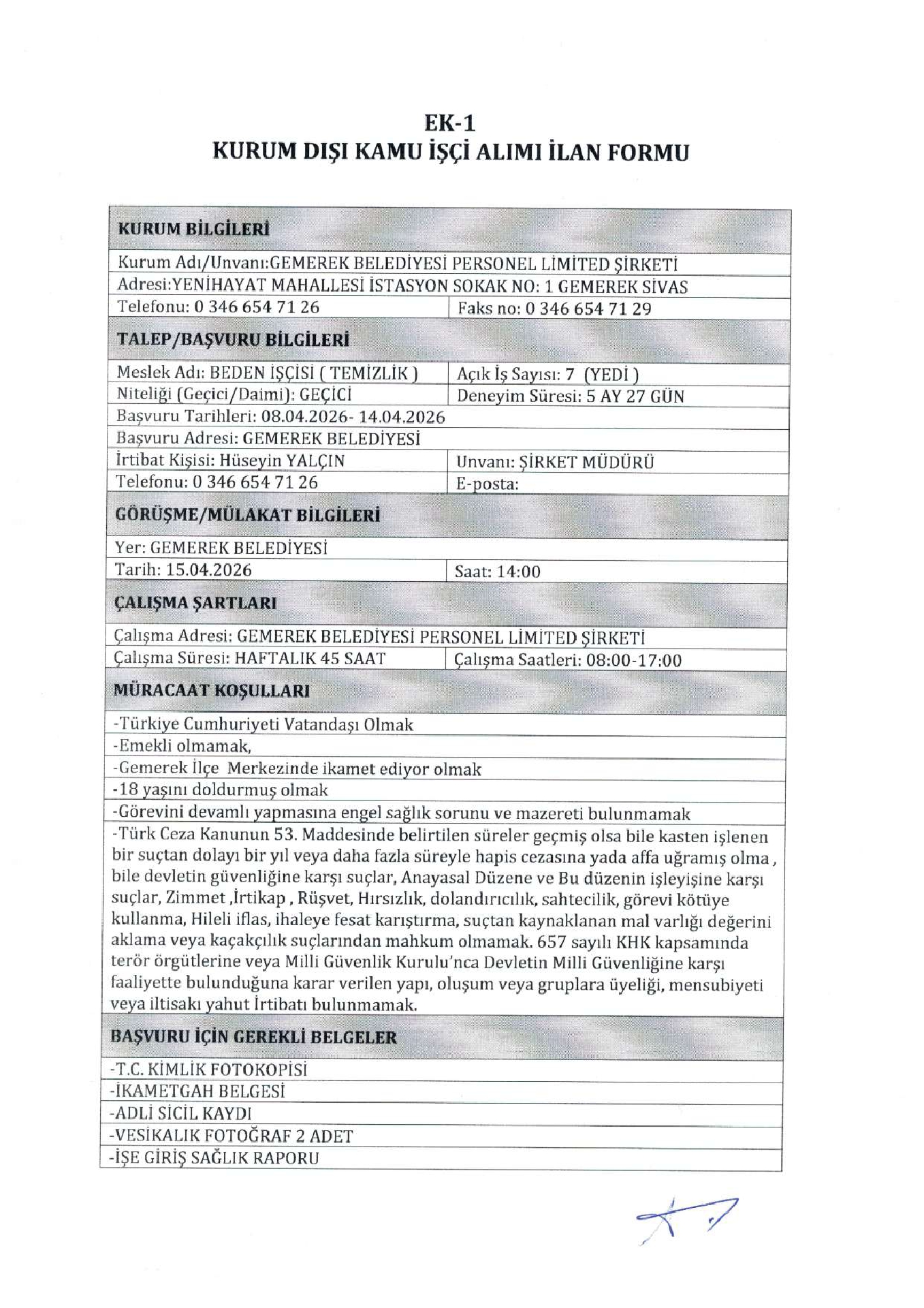 Ana sayfaGeçici İşçi İlanları Sivas Gemerek Belediyesi 7 İşçi Alacak Sivas Gemerek Belediyesi 7 İşçi Alacak. Son başvuru tarihi 14 Nisan 2026 Kaynak : İşkur İlan Giriş : 08 Nisan 2026 23:33, Son Güncelleme : 08 Nisan 2026 23:41 Yazdır Yorumlar (0) Abone Ol