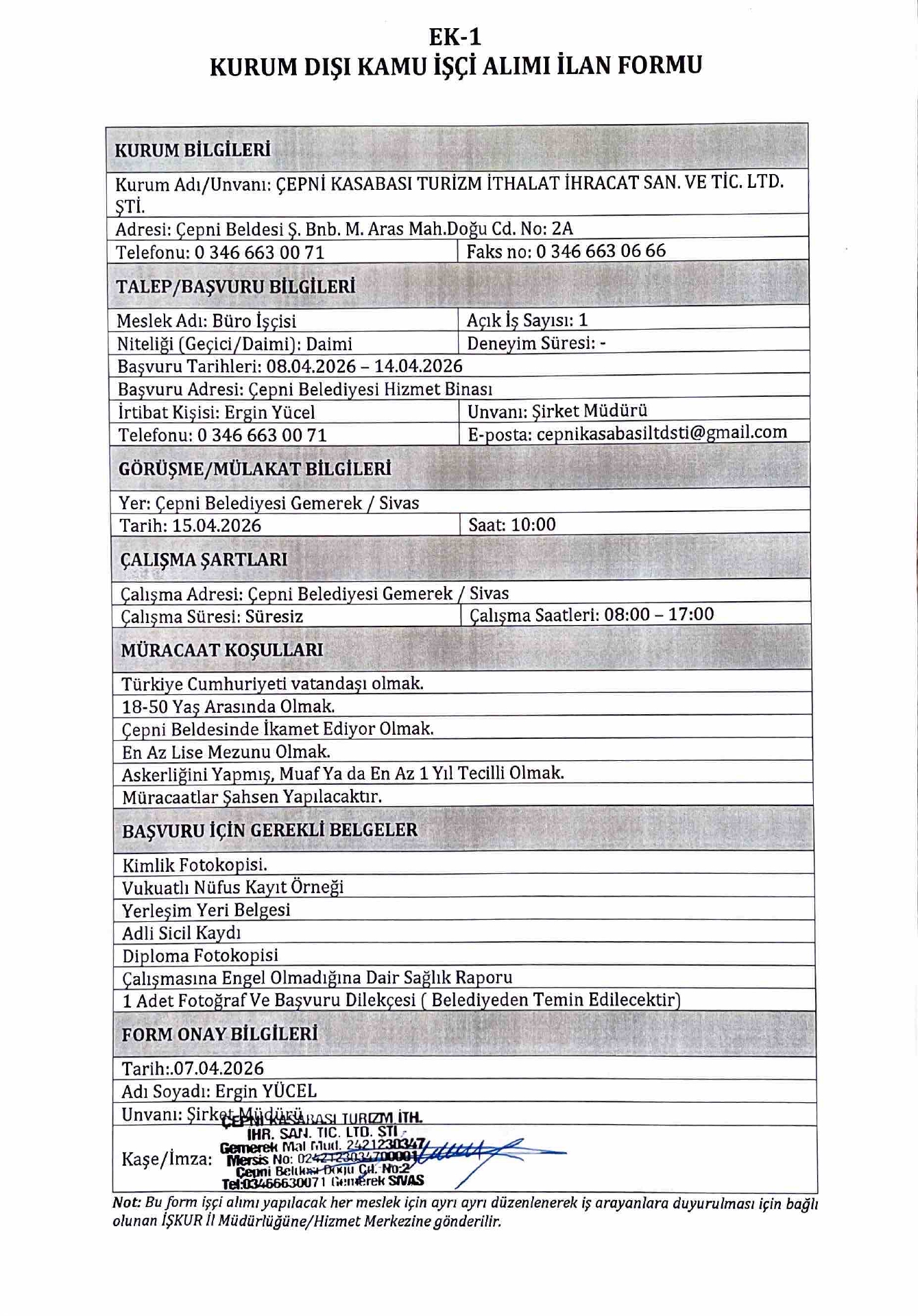 Ana sayfaDaimi İşçi İlanları Sivas Çepni Belediyesi 1 İşçi Alacak Sivas Çepni Belediyesi 1 İşçi Alacak. Son başvuru tarihi 14 Nisan 2026 Kaynak : İşkur İlan Giriş : 08 Nisan 2026 23:36, Son Güncelleme : 08 Nisan 2026 23:40 Yazdır Yorumlar (0) Abone Ol