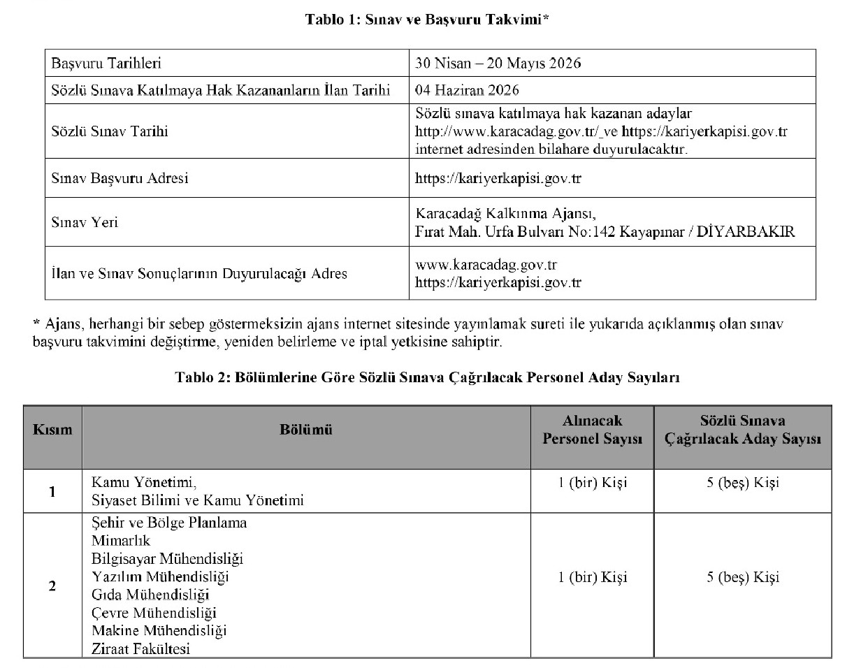 Başvurular, 30 Nisan 2026 tarihinden başlayarak, son başvuru zamanı olan 20 Mayıs 2026 tarihinde saat 23.59'a kadar https://kariyerkapisi.gov.tr adresinde bulunan Karacadağ Kalkınma Ajansı sınav başvuru bağlantısından yapılacaktır.