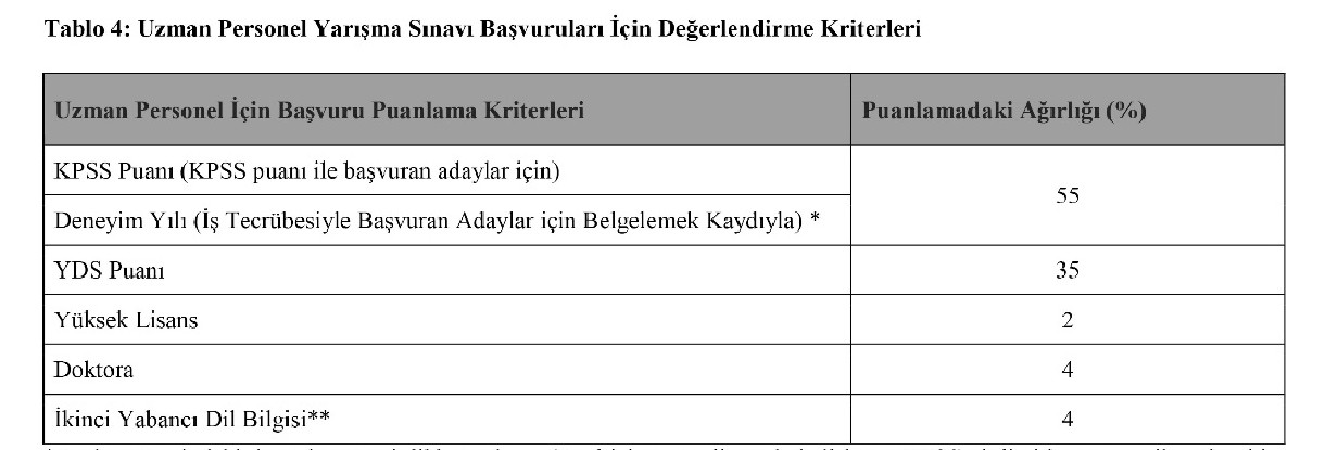 Ajansa yapılan başvurular, Tablo 4 he yer alan Uzman Personel Yarışma Sınavı Başvuruları İçin Değerlendirme Kriterlerine göre sıralanacaktır. Puan sıralamasına göre Tablo 3'te belirtilen Uzman Personel Alımı Yapılacak Bölümlerden pozisyon sayısının beş katı aday çağrılacak (toplam 10 aday). Ajansın internet sitesinde ilan edilecektir. Değerlendirme sonucu puanı son sıradaki aday ile eşit olan adaylar da yarışma sınavına davet edilecektir. Ancak, bu hükme göre sınava katılabileceği tespit edilmiş olup isimleri ilan olunan adaylardan, daha sonra sınava katılma şartlarını taşımadığı tespit edilenler ile gerçeğe aykırı bilgi verdiği veya herhangi bir şekilde gerçeği sakladığı belirlenen kişiler yarışma sınavına alınmayacaktır. Bunlardan sınava girmiş olanların sınavları geçersiz sayılacak ve bunlarla sözleşme yapılmayacaktır. Bu gibi durumları tespit edilenlerle sözleşme yapılmış olsa dahi sözleşmeleri feshedilecektir. Bu kişiler hiçbir hak talep edemeyecek olup haklarında Cumhuriyet Başsavcılığına suç duyurusunda bulunulacaktır.