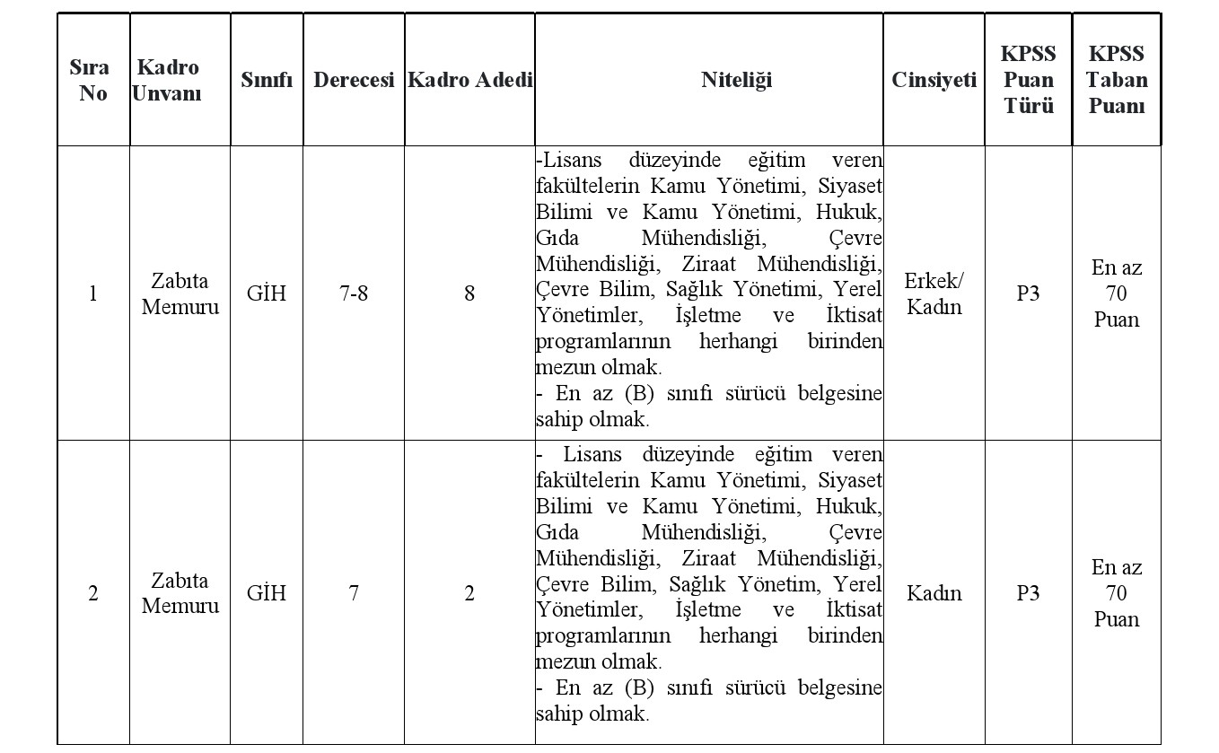 Kocaeli ili Dilovası Belediye Başkanlığı bünyesinde, 657 sayılı Devlet Memurları Kanununa tabi olarak istihdam edilmek üzere; Belediye Zabıta Yönetmeliği hükümlerine göre aşağıda unvanı, sınıfı, derecesi, adedi, nitelikleri, KPSS puan türü, KPSS taban puanı ve diğer şartları taşımak kaydıyla belirtilen boş kadrolara açıktan atama yoluyla zabıta memuru alımı yapılacaktır.
