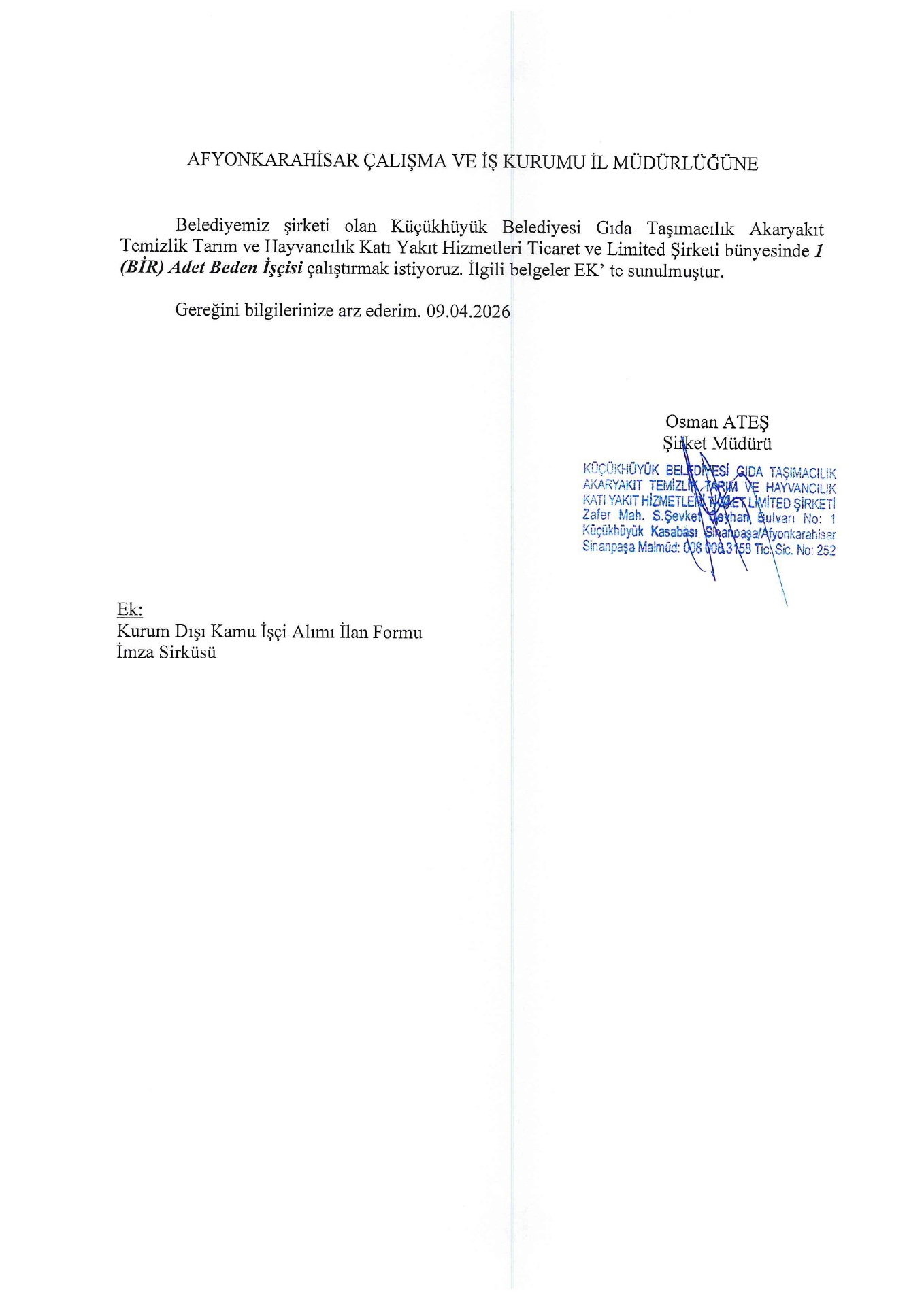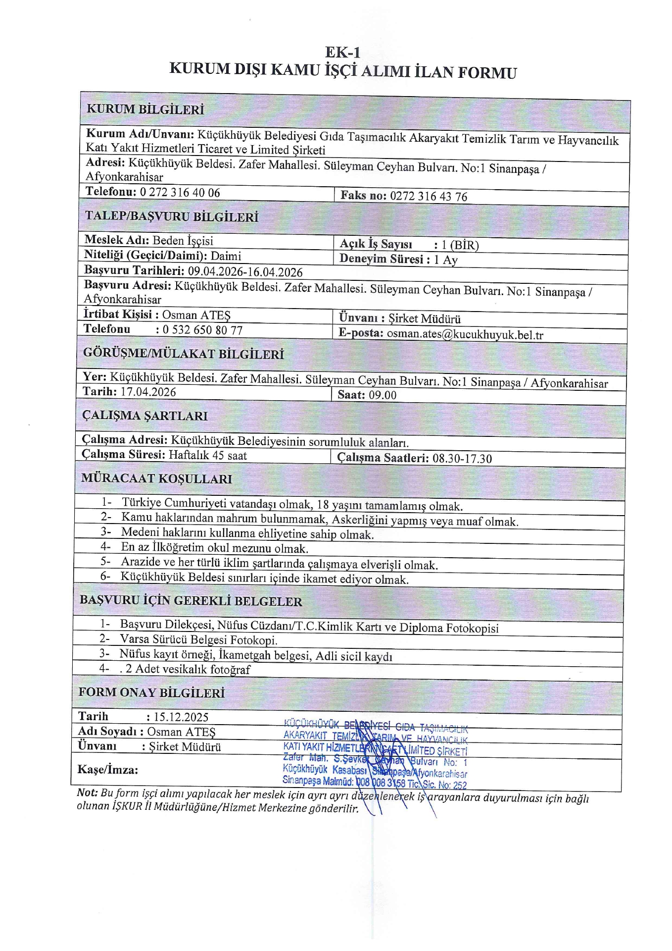 Ana sayfaDaimi İşçi İlanları Afyonkarahisar Küçükhüyük Belediyesi 1 İşçi Alacak Afyonkarahisar Küçükhüyük Belediyesi 1 İşçi Alacak. Son başvuru tarihi 16 Nisan 2026 Kaynak : İşkur İlan Giriş : 09 Nisan 2026 23:17, Son Güncelleme : 09 Nisan 2026 23:47 Yazdır Yorumlar (0) Abone Ol
