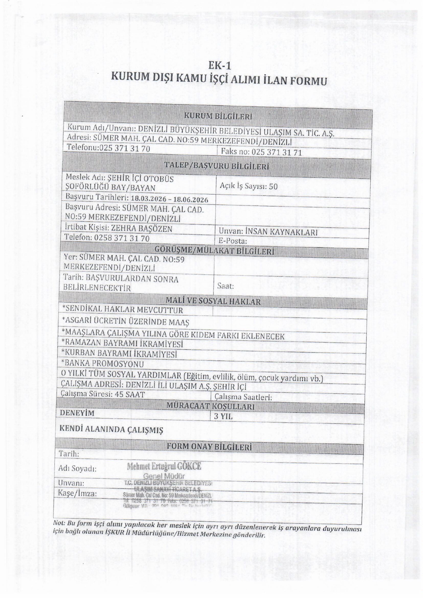 Denizli Büyükşehir Belediyesi 50 İşçi Alacak. Son başvuru tarihi 18 Haziran 2026
