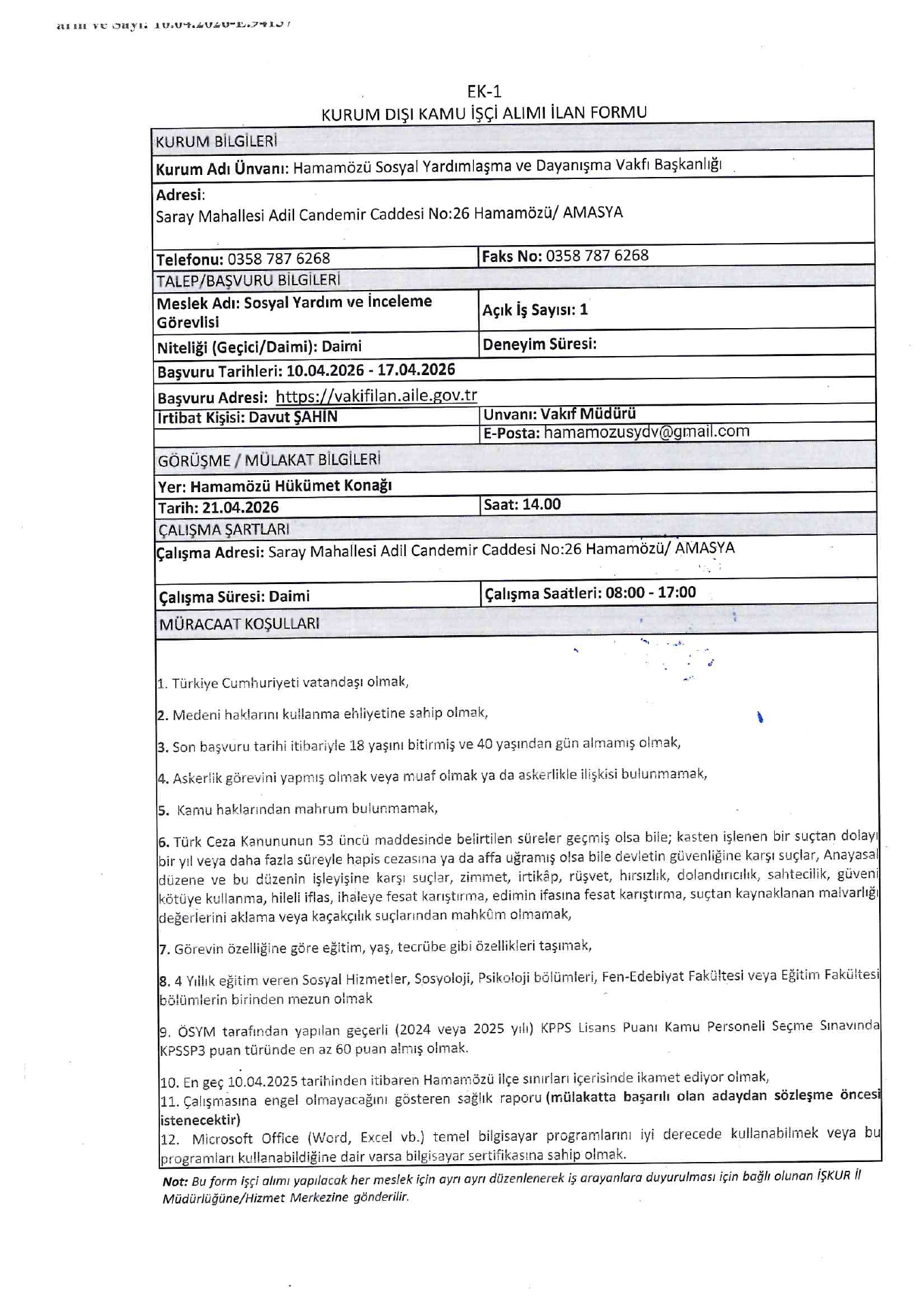 Amasya Hamamözü SYDV 1 İşçi Alacak. Son başvuru tarihi 17 Nisan 2026