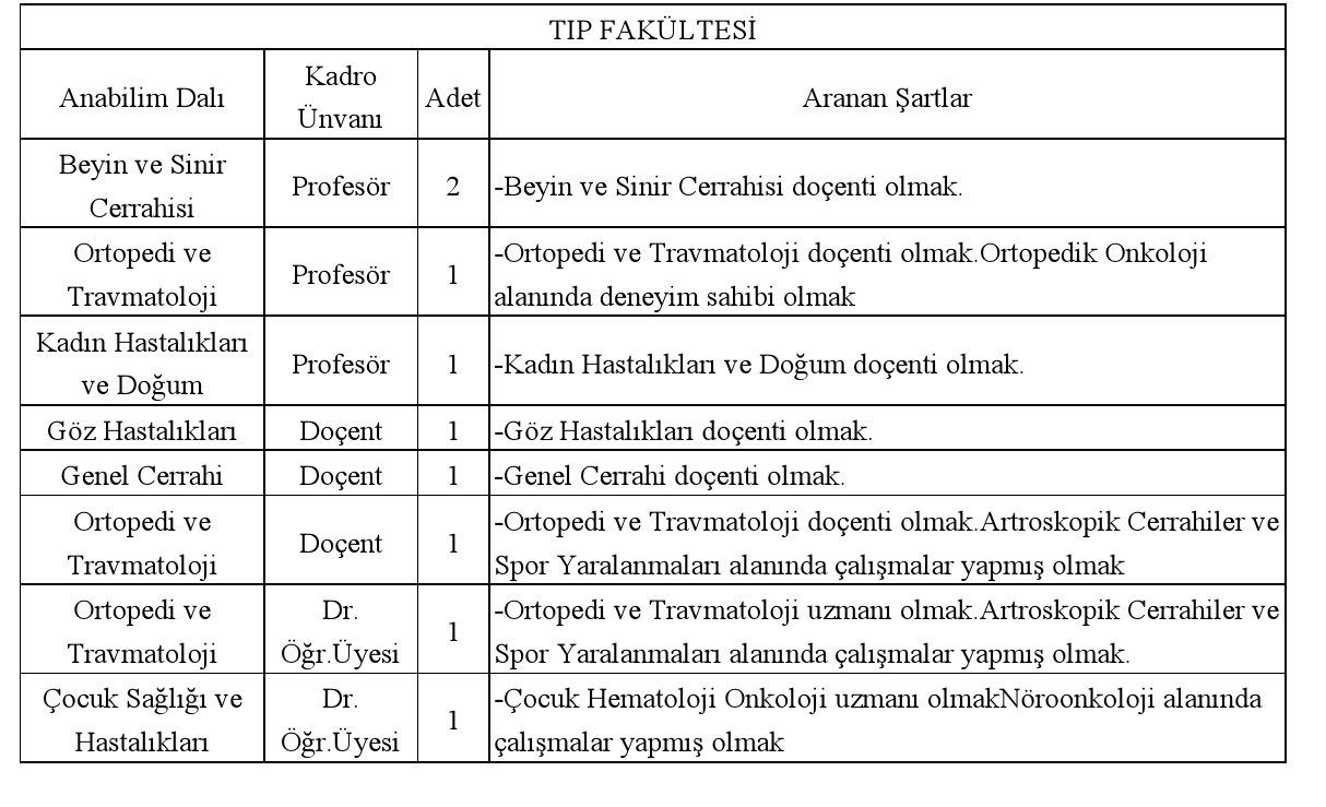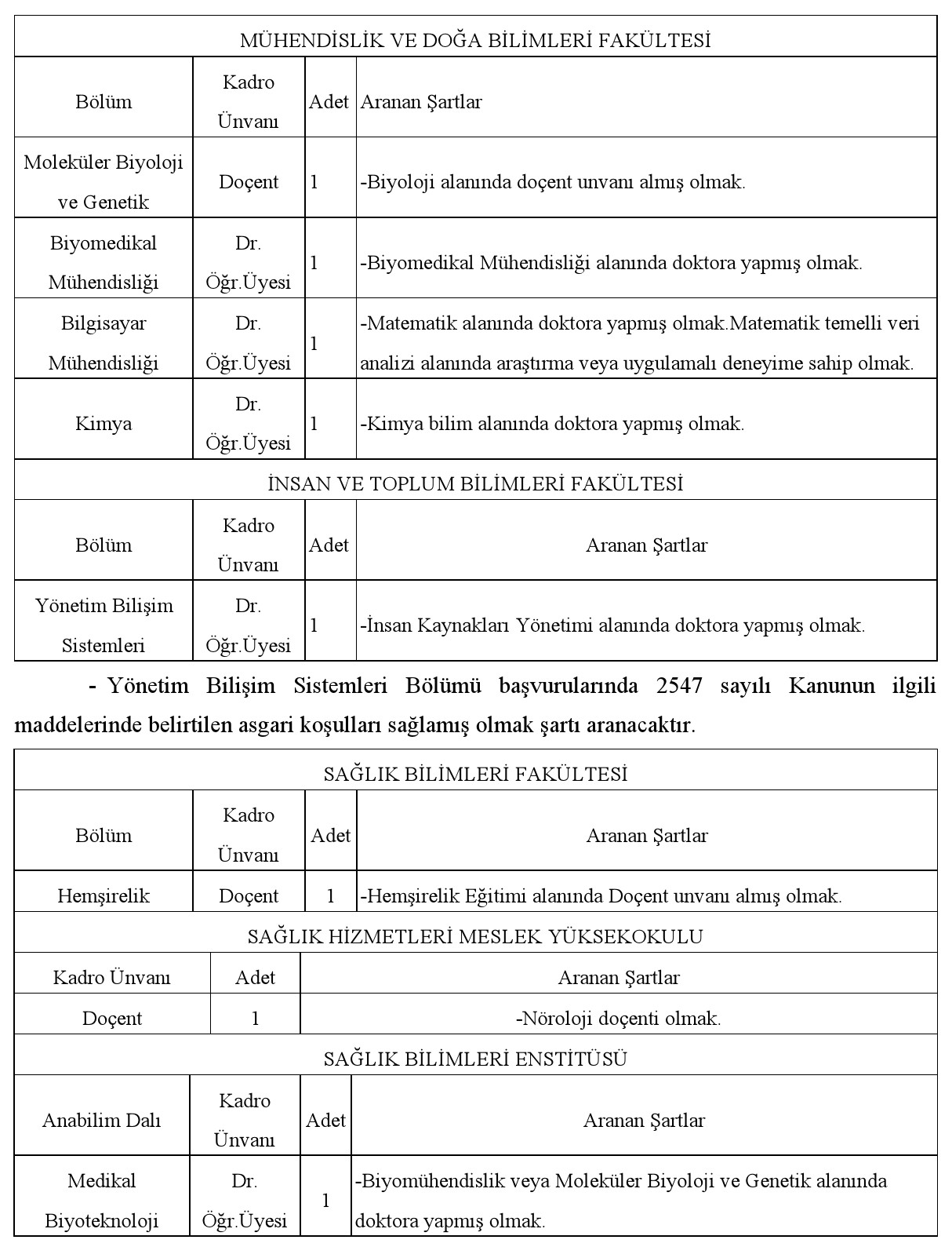 Doçent kadrosu daimi statüde olup, atanmak isteyen adayların YÖK formatında özgeçmişlerini, noterden tasdikli doçentlik belgesi ve diğer diplomalarını, bilimsel çalışma ve yayınlarını 4 takım halinde USB taşınabilir belleğe ekleyerek dilekçeyle birlikte ilan tarihinden itibaren Rektörlüğümüze on beş (15) gün içinde bizzat başvurmaları, ayrıca Doçent kadrosuna başvuracak adayların Üniversitelerarası Kurul tarafından değişecek bilim alanları için ayrı ayrı belirlenen ve halen yürürlükte olan Doçentlik kriterlerini sağlamış olmaları gerekmektedir.