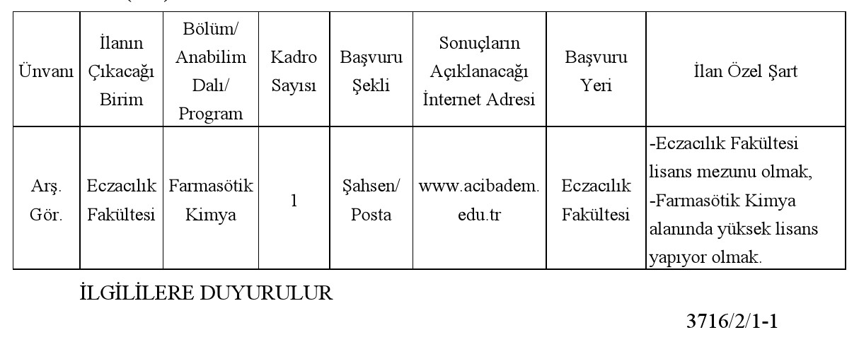 Üniversitemiz Eczacılık Fakültesine 2547 sayılı Yükseköğretim Kanunu'nun 33. maddesi ile "Öğretim Üyesi Dışındaki Öğretim Elemanı kadrolarına Yapılacak Atamalarda Uygulanacak Merkezi Sınav ile Giriş Sınavlarına İlişkin Usul ve Esaslar Hakkında Yönetmelik'in ilgili maddeleri uyarınca unvanı ve nitelikleri belirtilen kadroya Araştırma Görevlisi alınacaktır. (Adayların Devlet Hizmeti Yükümlülüğü bulunmaması ve Yabancı ülkelerden alınan diplomaların denkliğinin onaylanmış olması gerekmektedir.)
