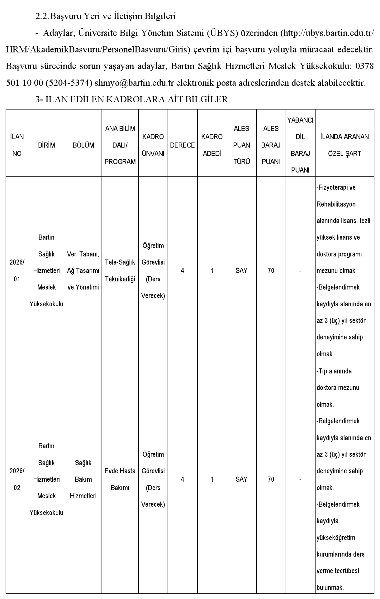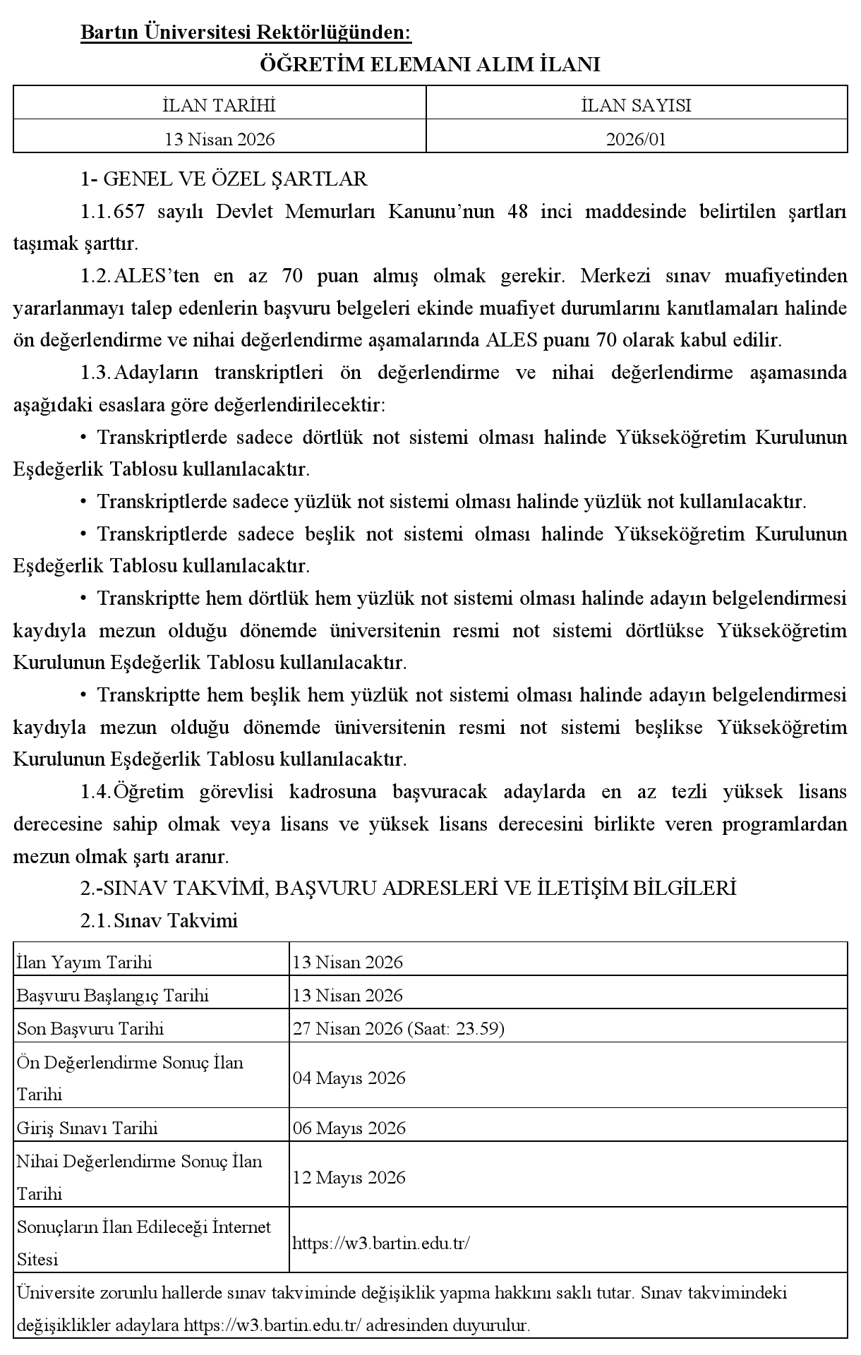 Bartın Üniversitesi Öğretim Elemanı Alım İlanı. Son başvuru tarihi 27 Nisan 2026